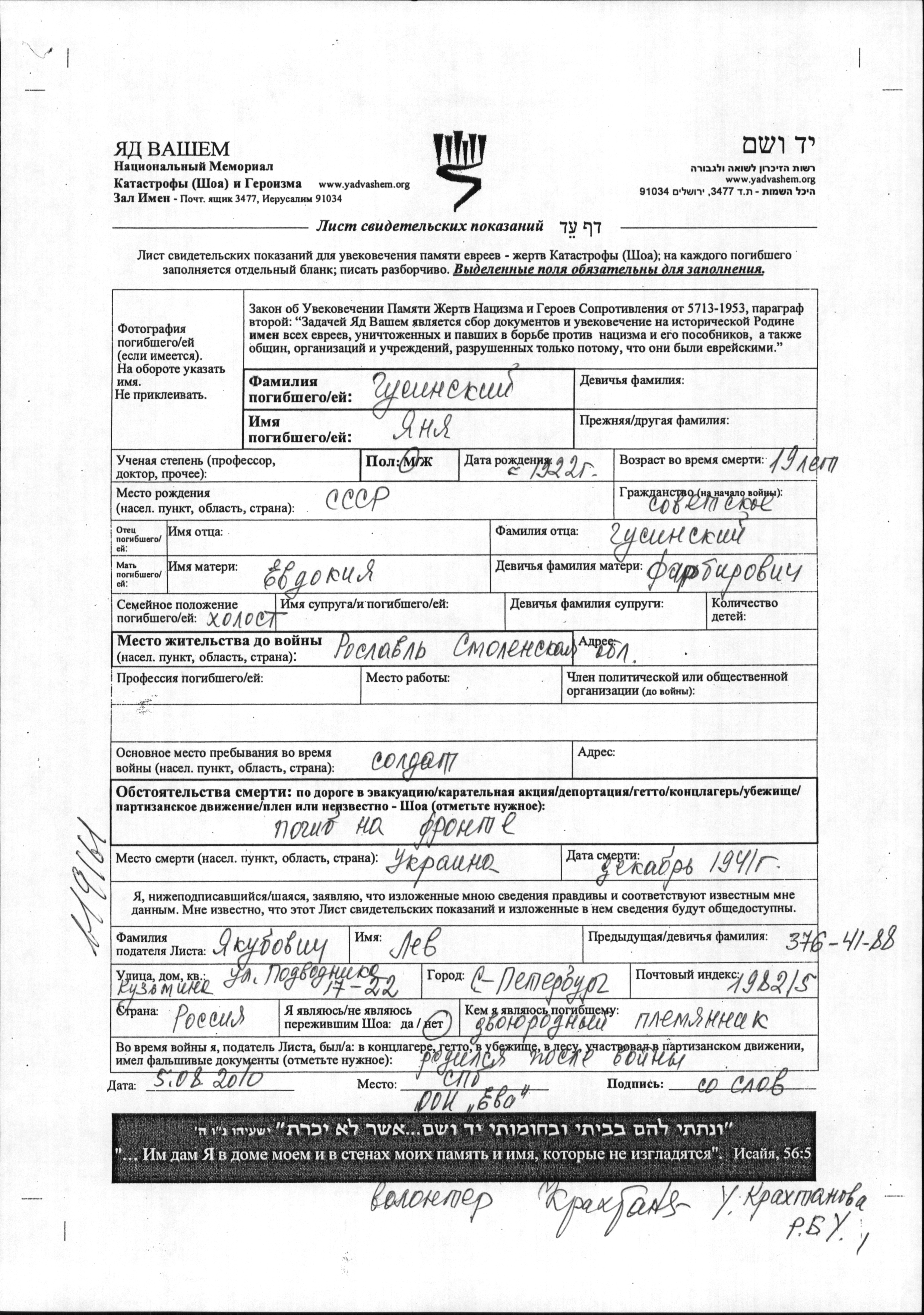 Yanya Gusinski wurde im Jahr 1922 geboren. Er war der Sohn von Yevdokiya, geb. Farbirovich. Er war Ledig. Vor dem Zweiten Weltkrieg lebte er in Roslavl, Russland (UdSSR). Während des Krieges war er in die Sowjetischen Streitkräfte. Yanya im Militärdienst umgekommen. Todesort: Ukraine (UdSSR) im Jahr 12/1941.
