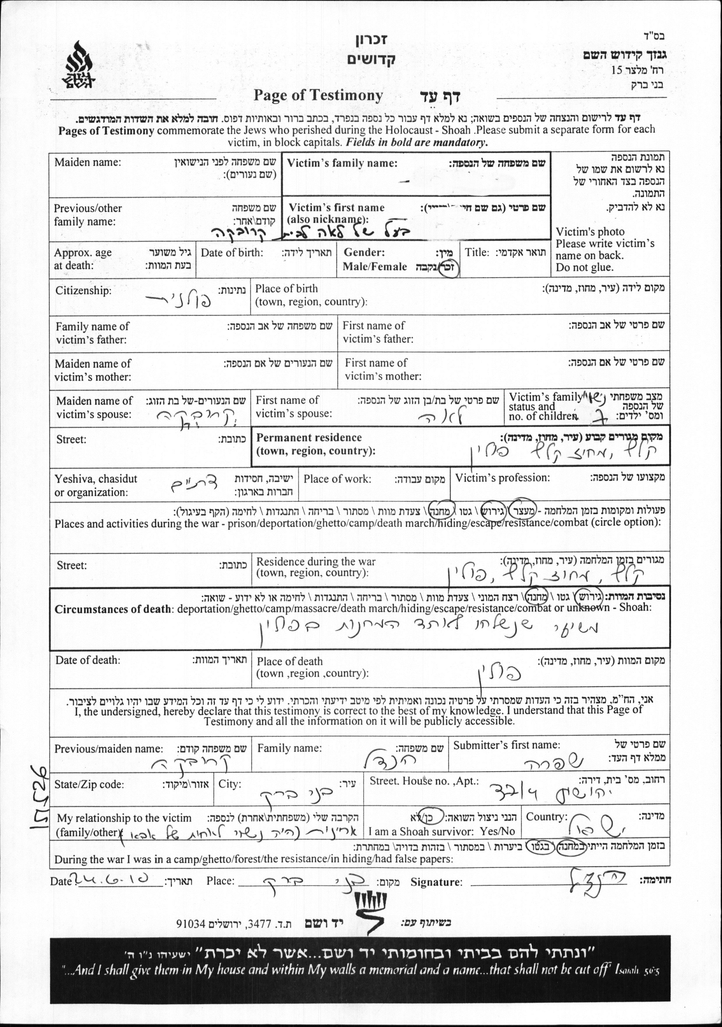 Vorname unbekannt Name unbekannt. Er war mit Lea, geb. Kruvka Verheiratet. Vor dem Zweiten Weltkrieg lebte er in Kielce, Polen. Während des Krieges war er in Kielce, Polen.