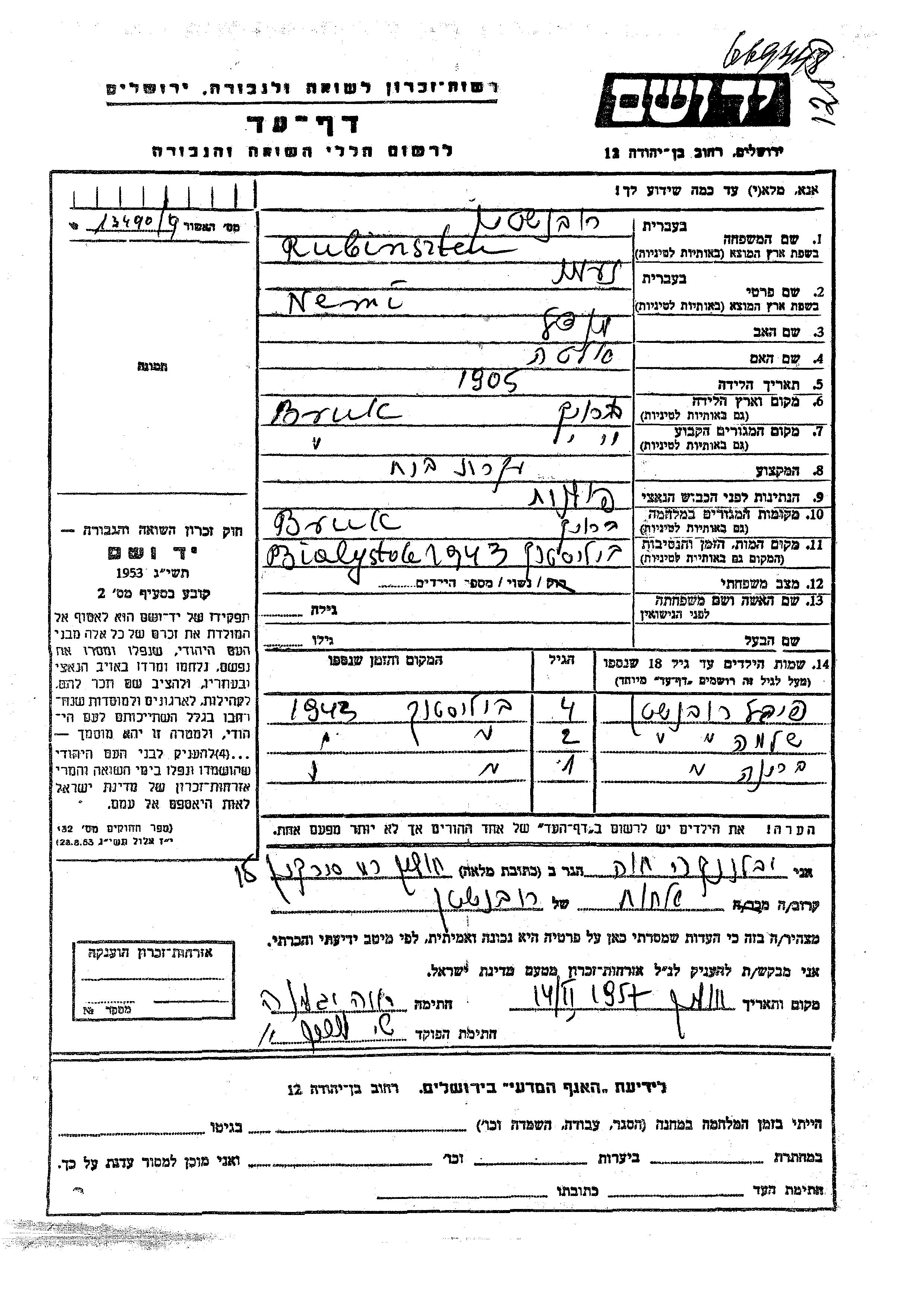 Nemi Naomi Rubinszten wurde im Jahr 1905 in Brok, Polen geboren. Sie war die Tochter von Mendel und Alte. Sie war Hausfrau und Verheiratet. Vor dem Zweiten Weltkrieg lebte sie in Brok, Polen. Während des Krieges war sie in Brok, Polen.