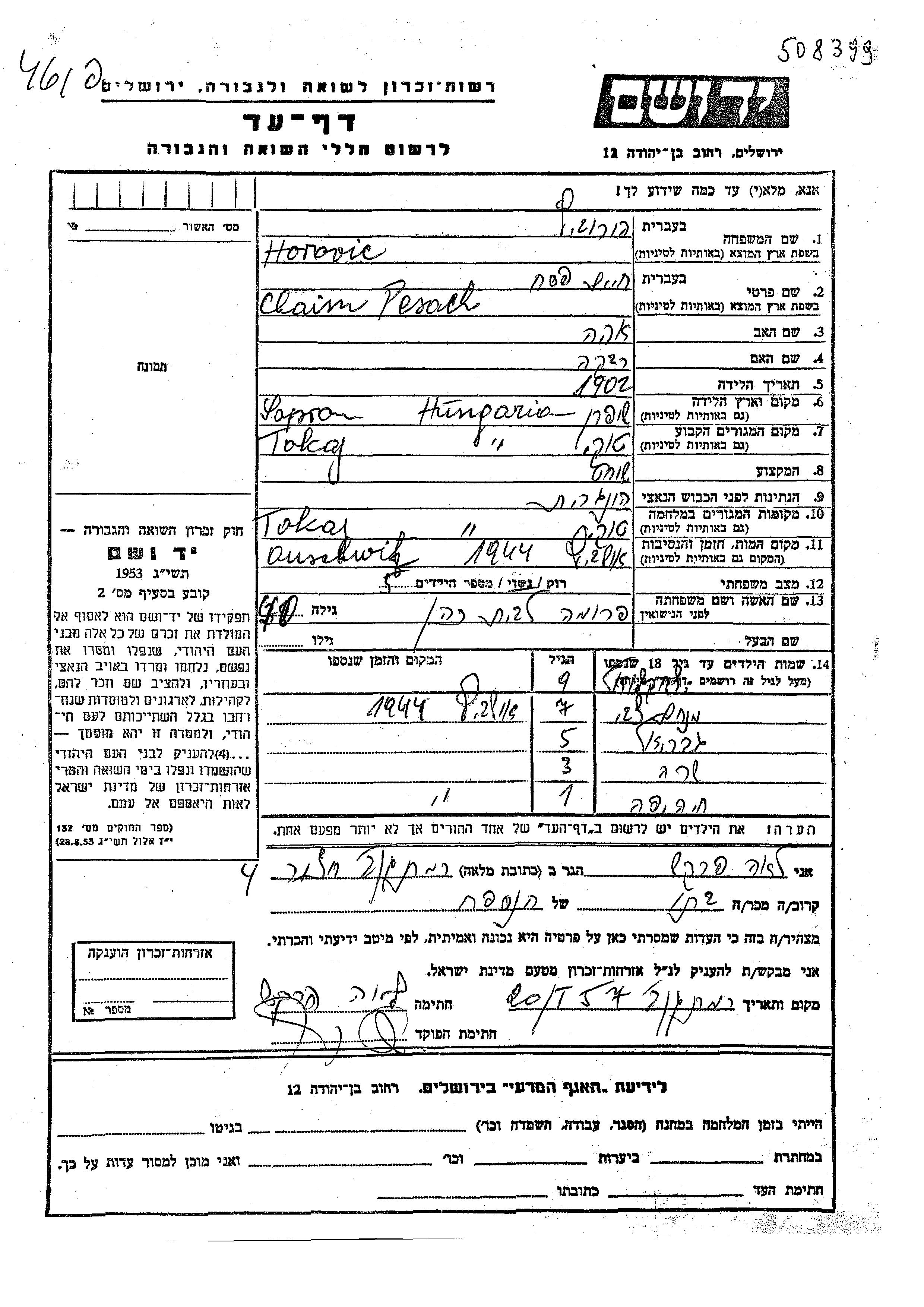 Chaim Pesach Horovic wurde im Jahr 1902 in Sopron, Ungarn geboren. Er war der Sohn von Arie und Rivka. Er war Schächter und mit Fruma, geb. Kohen Verheiratet. Vor dem Zweiten Weltkrieg lebte er in Tokaj, Ungarn. Während des Krieges war er in Tokaj, Ungarn.