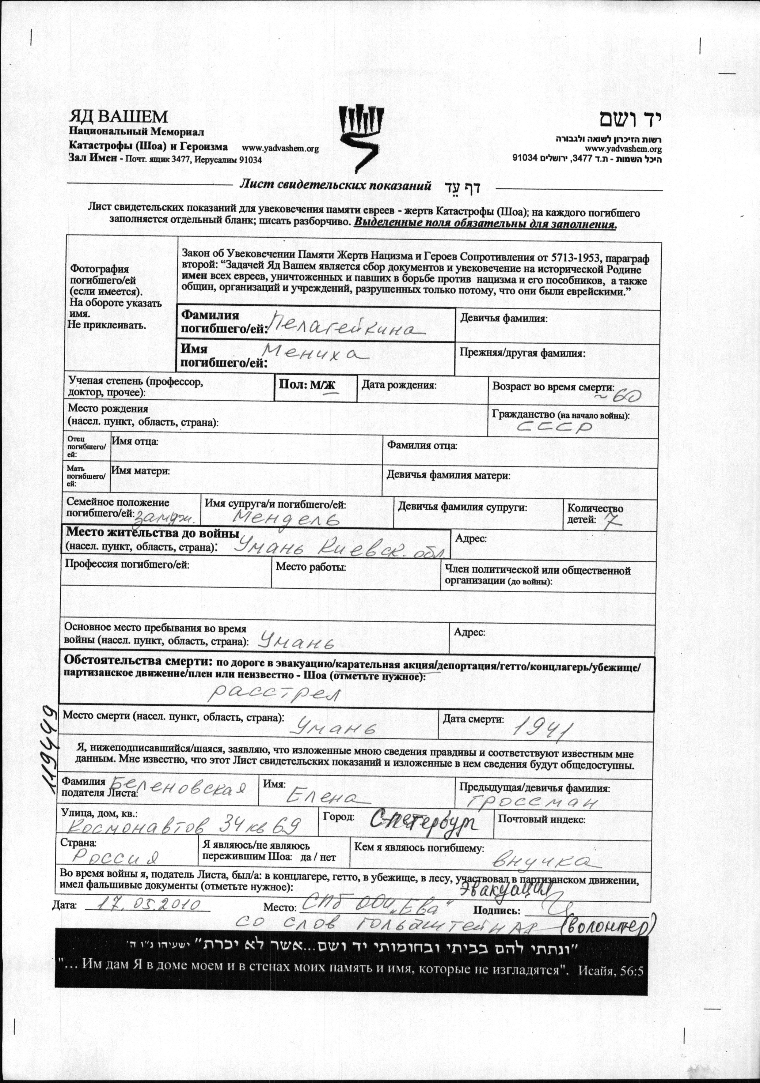 Menukha Pelageykina. Sie war mit Mendel Verheiratet. Vor dem Zweiten Weltkrieg lebte sie in Uman, Ukraine (UdSSR). Während des Krieges war sie in Uman, Ukraine (UdSSR).