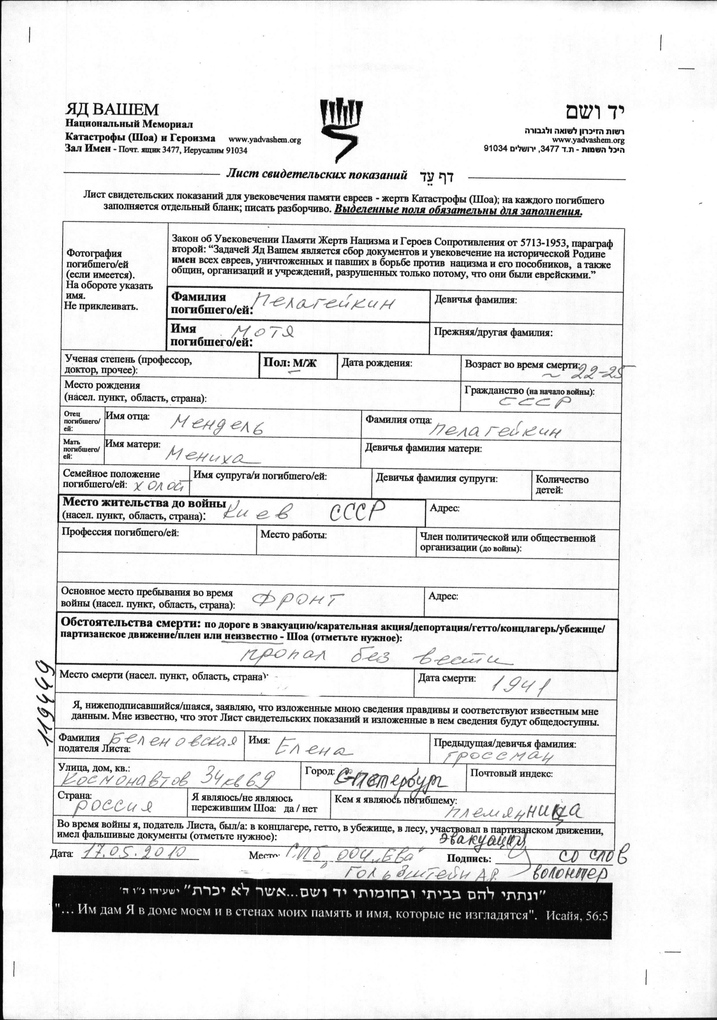 Motya Pelageykin wurde Er war der Sohn von Mendel und Menikha. Er war Ledig. Vor dem Zweiten Weltkrieg lebte er in Kiev, Ukraine (UdSSR). Während des Krieges war er in die Sowjetischen Streitkräfte.