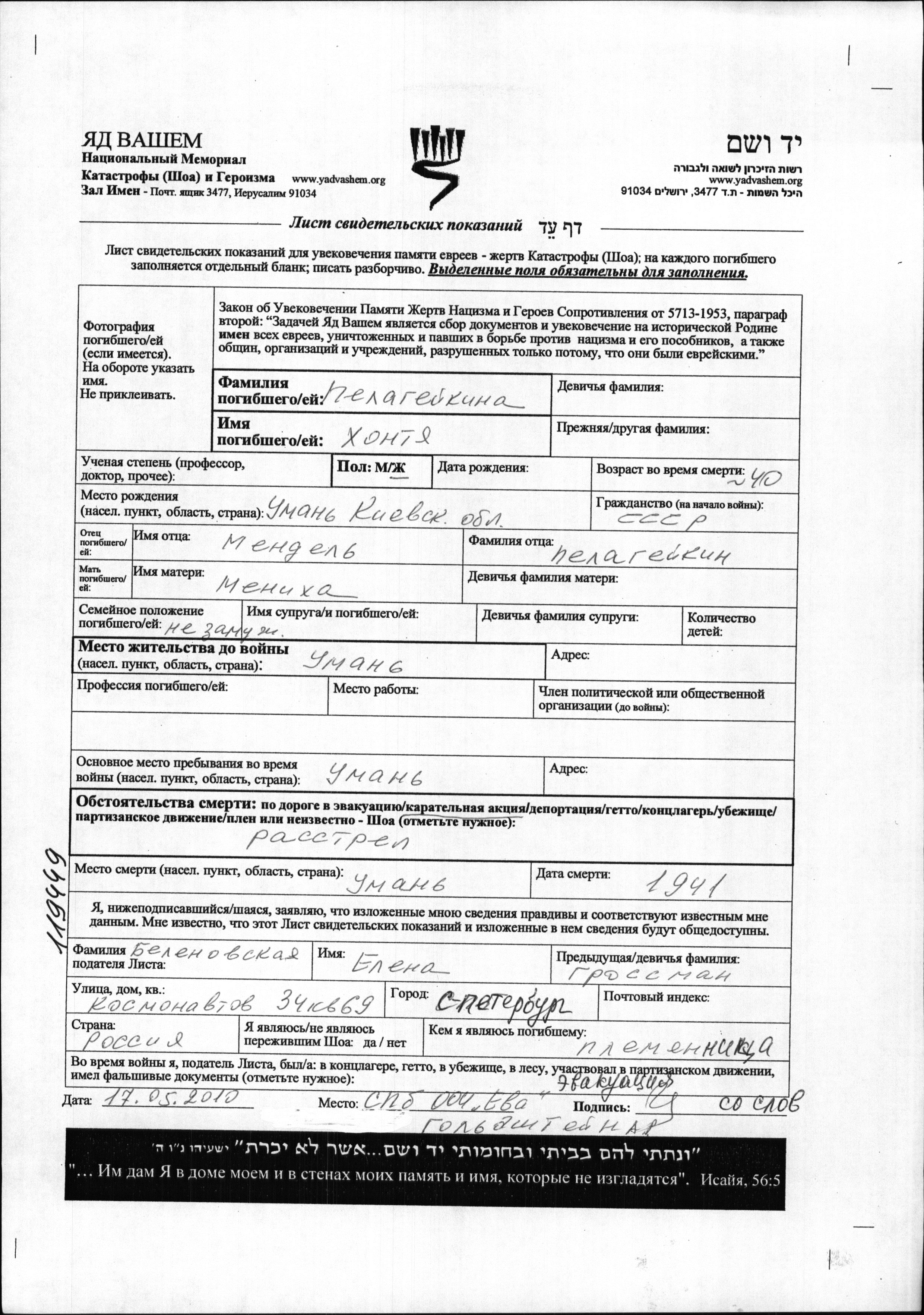 Khontya Pelageykina wurde in Uman, Ukraine (UdSSR) geboren. Sie war die Tochter von Mendel und Menikha. Sie war Ledig. Vor dem Zweiten Weltkrieg lebte sie in Uman, Ukraine (UdSSR). Während des Krieges war sie in Uman, Ukraine (UdSSR).
