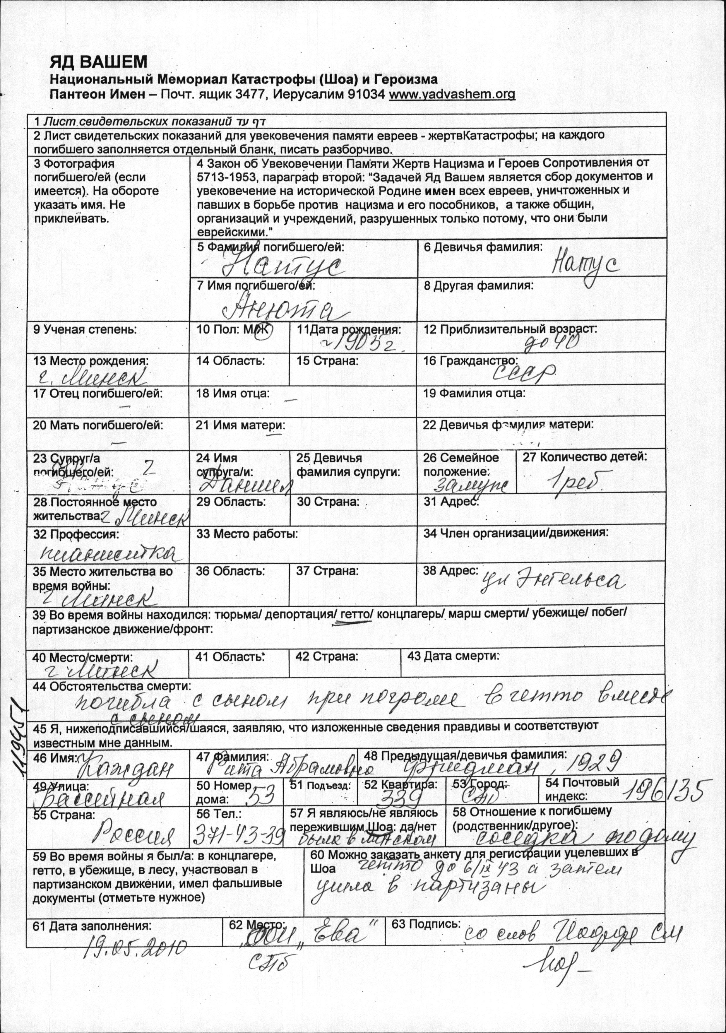 Anyuta wurde in der Schoah ermordet. Todesort: Minsk, Weißrussland (UdSSR).