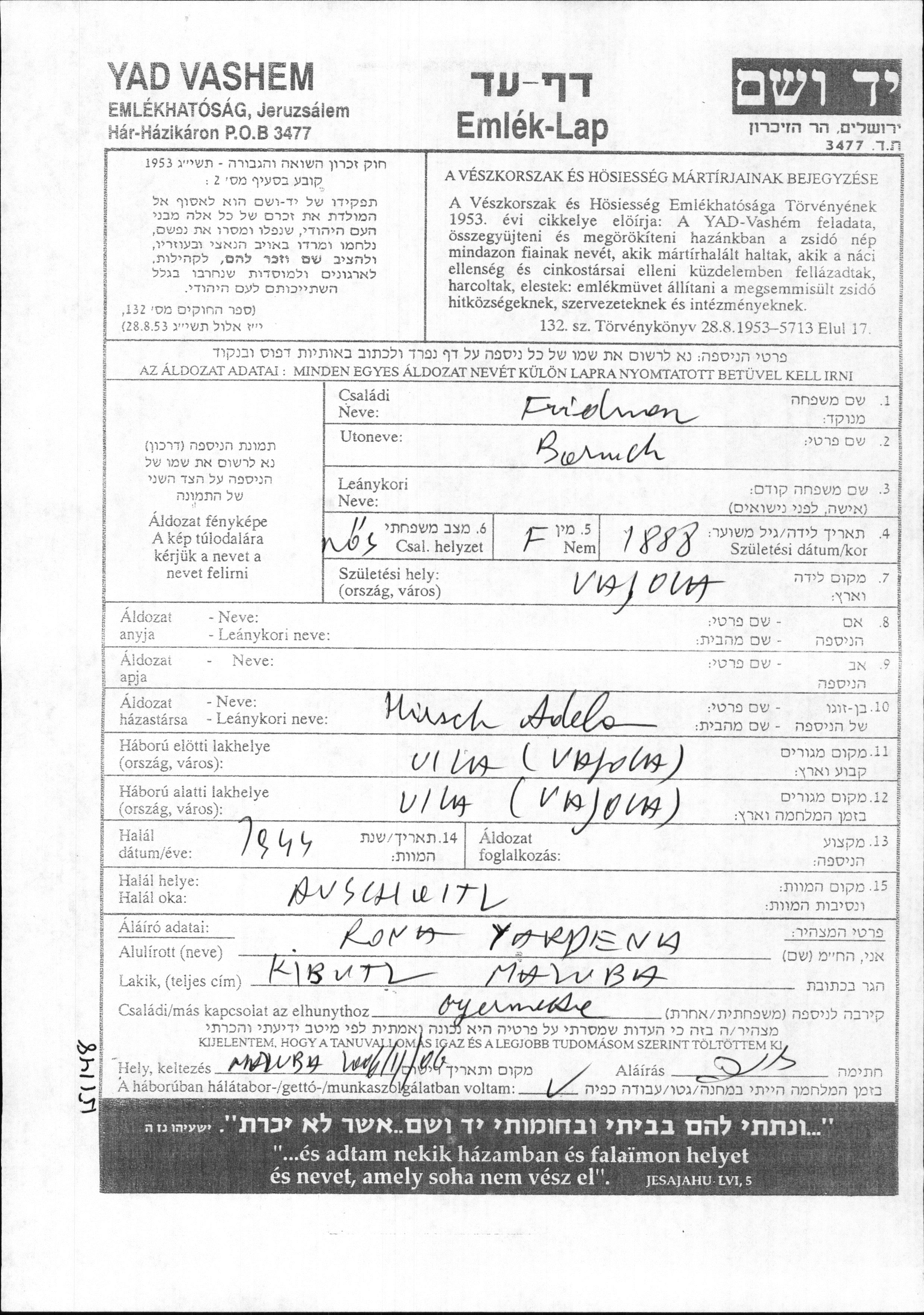 Baruch Fridman wurde im Jahr 1888 in Vaiola, Rumänien geboren. Er war mit Hirsch Adela Verheiratet. Vor dem Zweiten Weltkrieg lebte er in Vaiola, Rumänien. Während des Krieges war er in Vaiola, Rumänien.