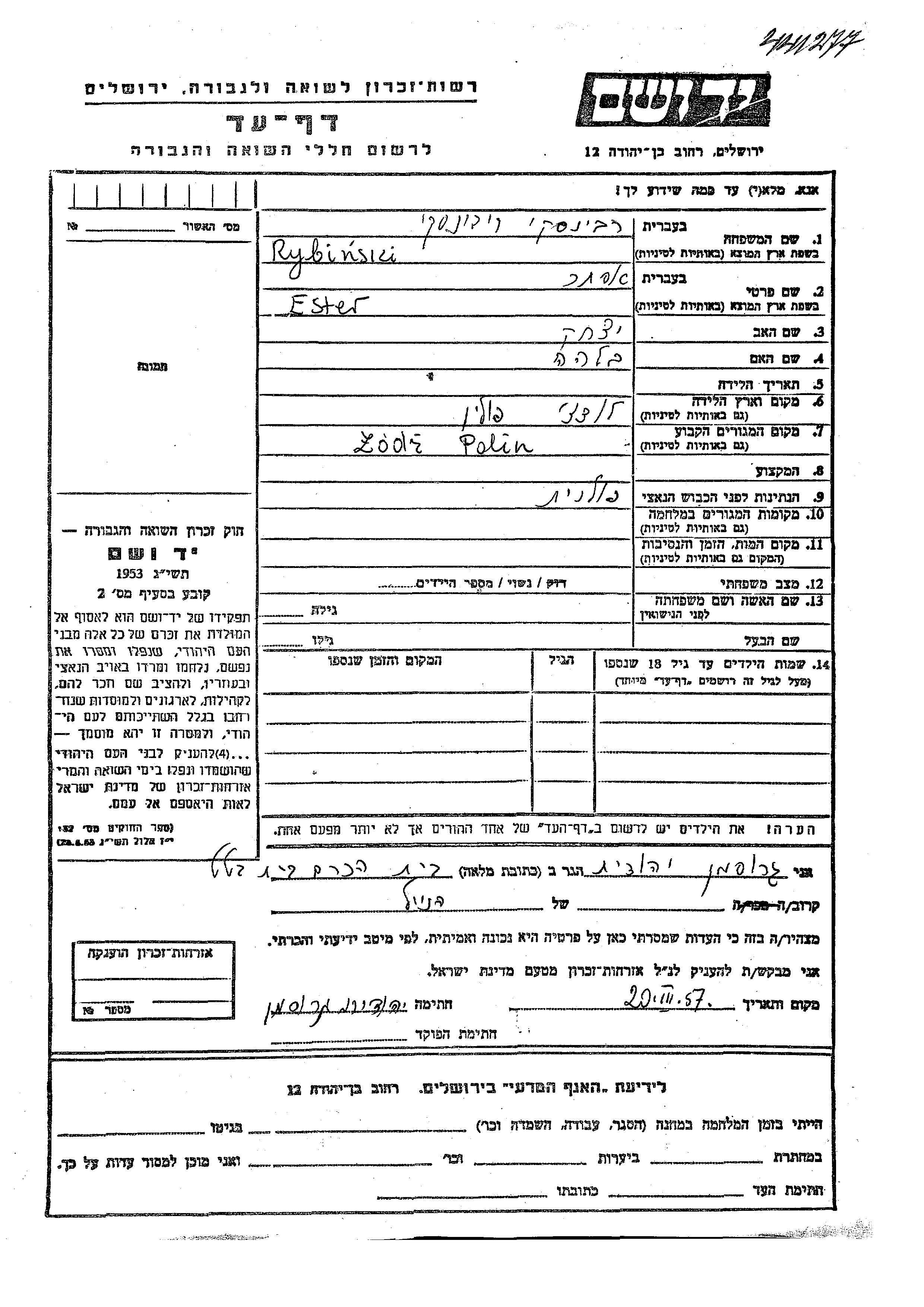 Ester Rybinski wurde in Lodz, Polen geboren. Sie war die Tochter von Yitzkhak und Bilha. Sie war Verheiratet. Vor dem Zweiten Weltkrieg lebte sie in Lodz, Polen.