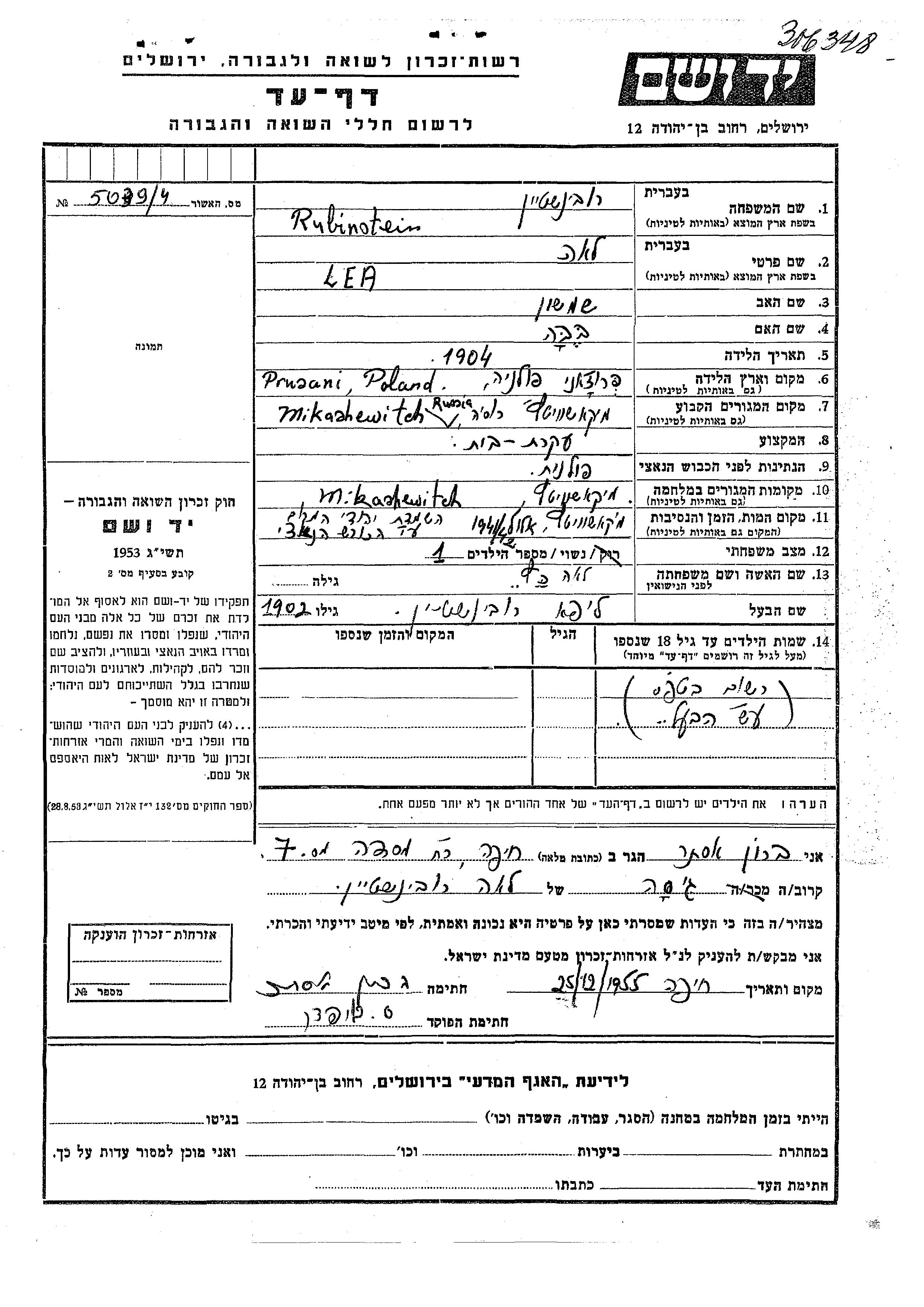 Lea Rubinstein, geb. Katz wurde im Jahr 1904 in Pruzana, Polen geboren. Sie war die Tochter von Shimshon und Beba. Sie war Hausfrau und mit Lipa Verheiratet. Vor dem Zweiten Weltkrieg lebte sie in Mikaszewicze, Polen. Während des Krieges war sie in Mikaszewicze, Polen.