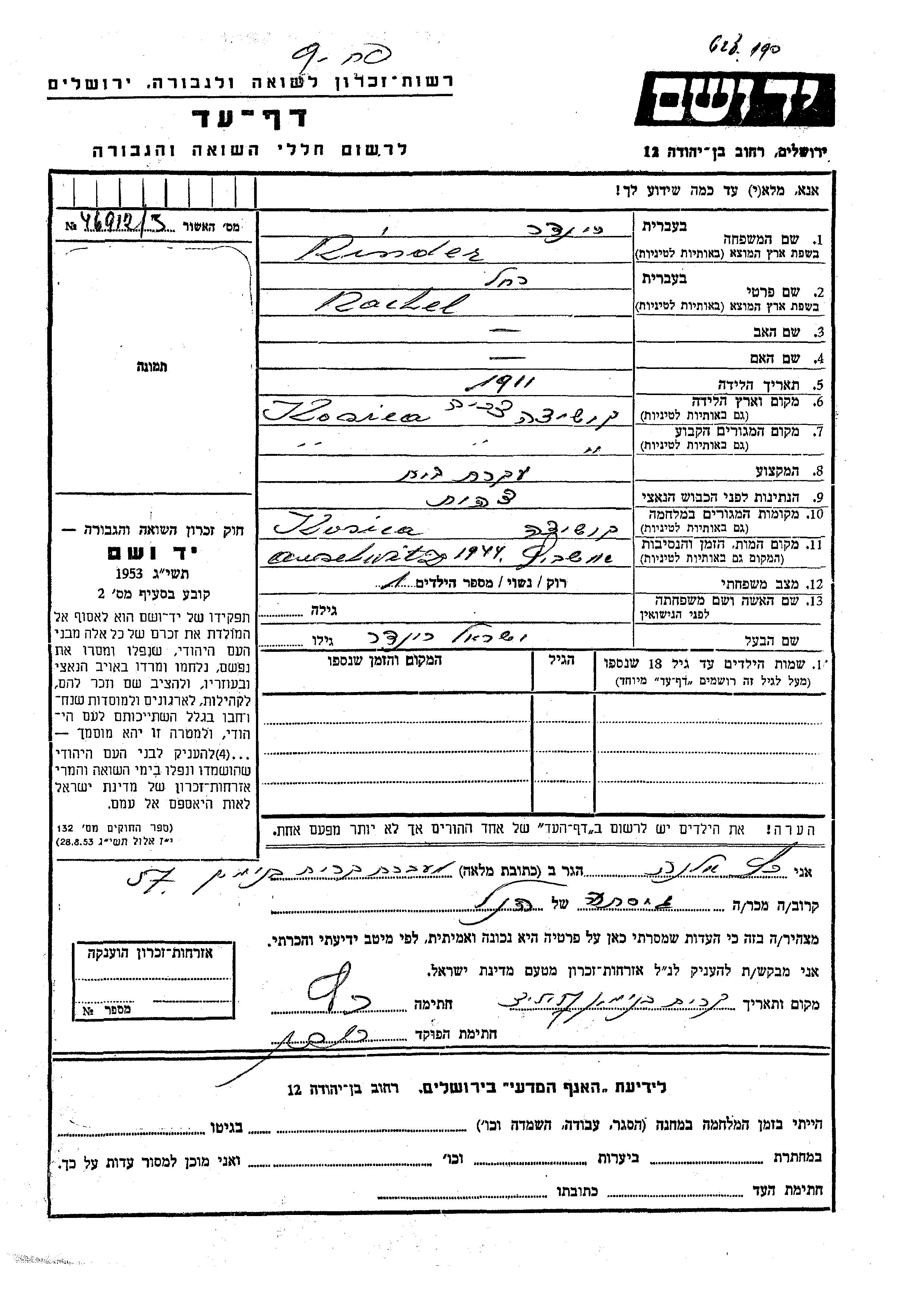 Rachel Rinder wurde im Jahr 1911 in Kosice, Tschechoslowakei geboren. Sie war Hausfrau und mit Yisrael Verheiratet. Vor dem Zweiten Weltkrieg lebte sie in Kosice, Tschechoslowakei. Während des Krieges war sie in Kosice, Tschechoslowakei.