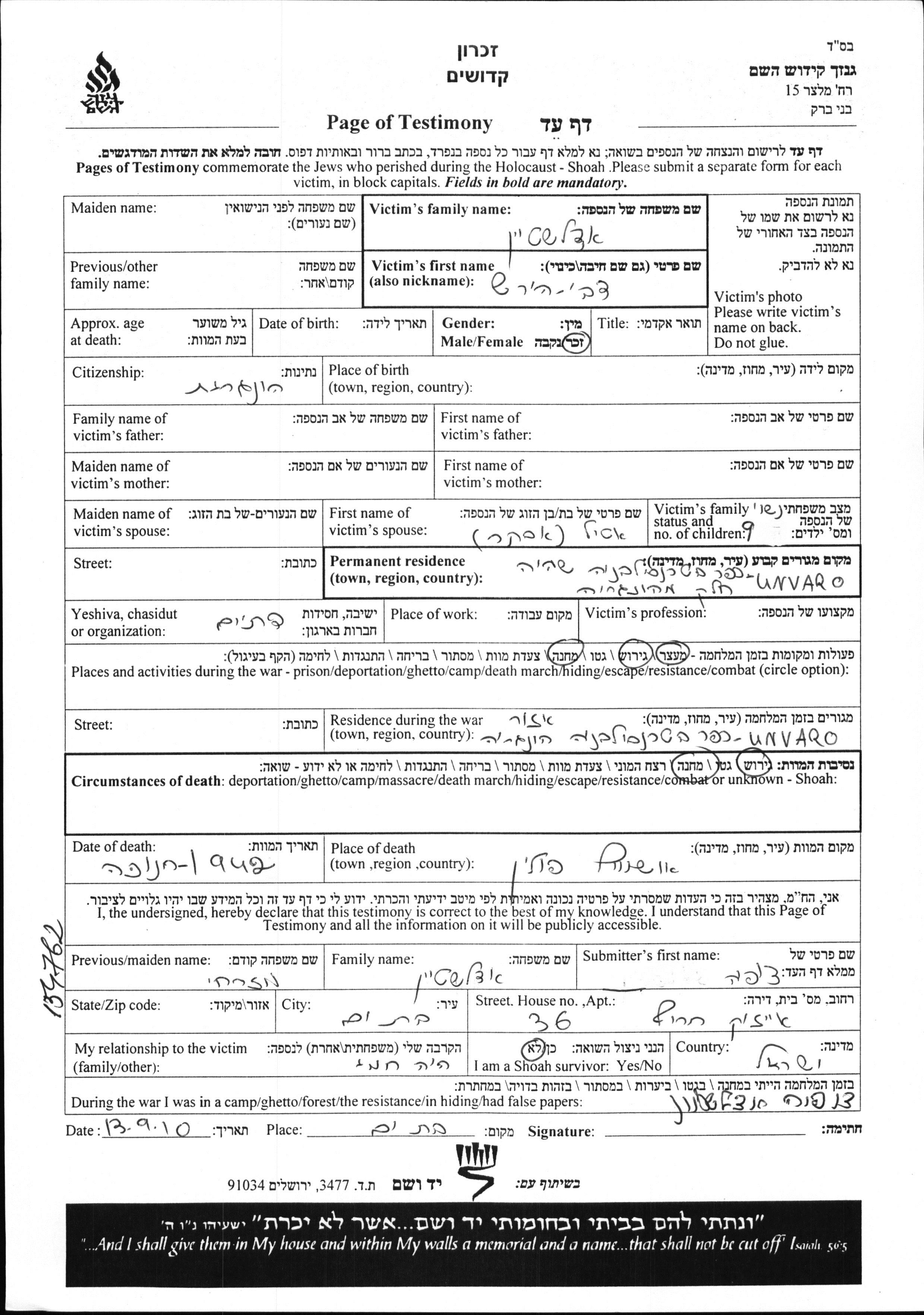 Tzvi Hirsh Edelshtein. Er war mit Etil Verheiratet. Vor dem Zweiten Weltkrieg lebte er in Ujvaros, Rumänien. Während des Krieges war er in Ujvaros, Rumänien.