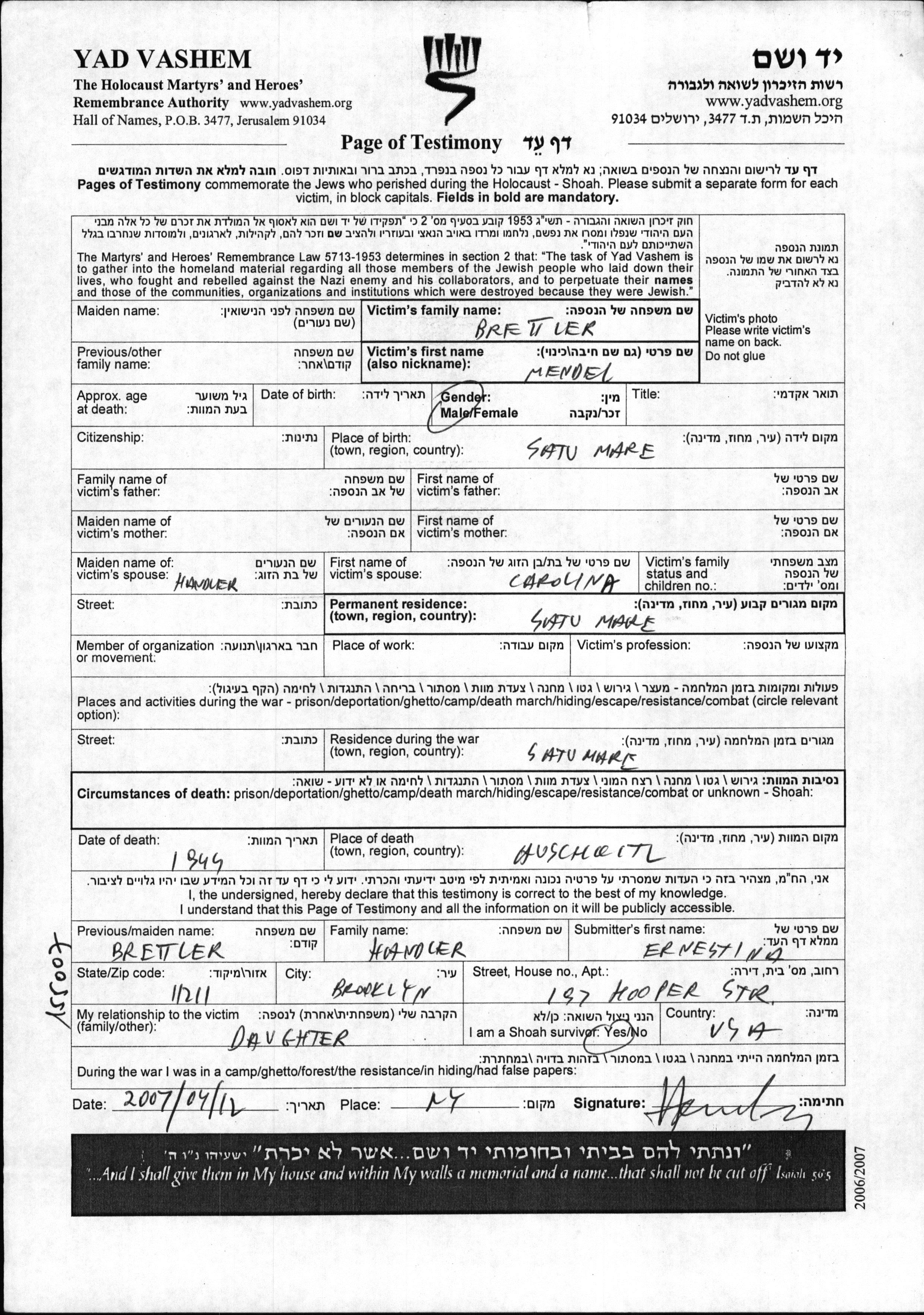 Brettler Mendel Satu Mare, Rumänien Gedenkblatt