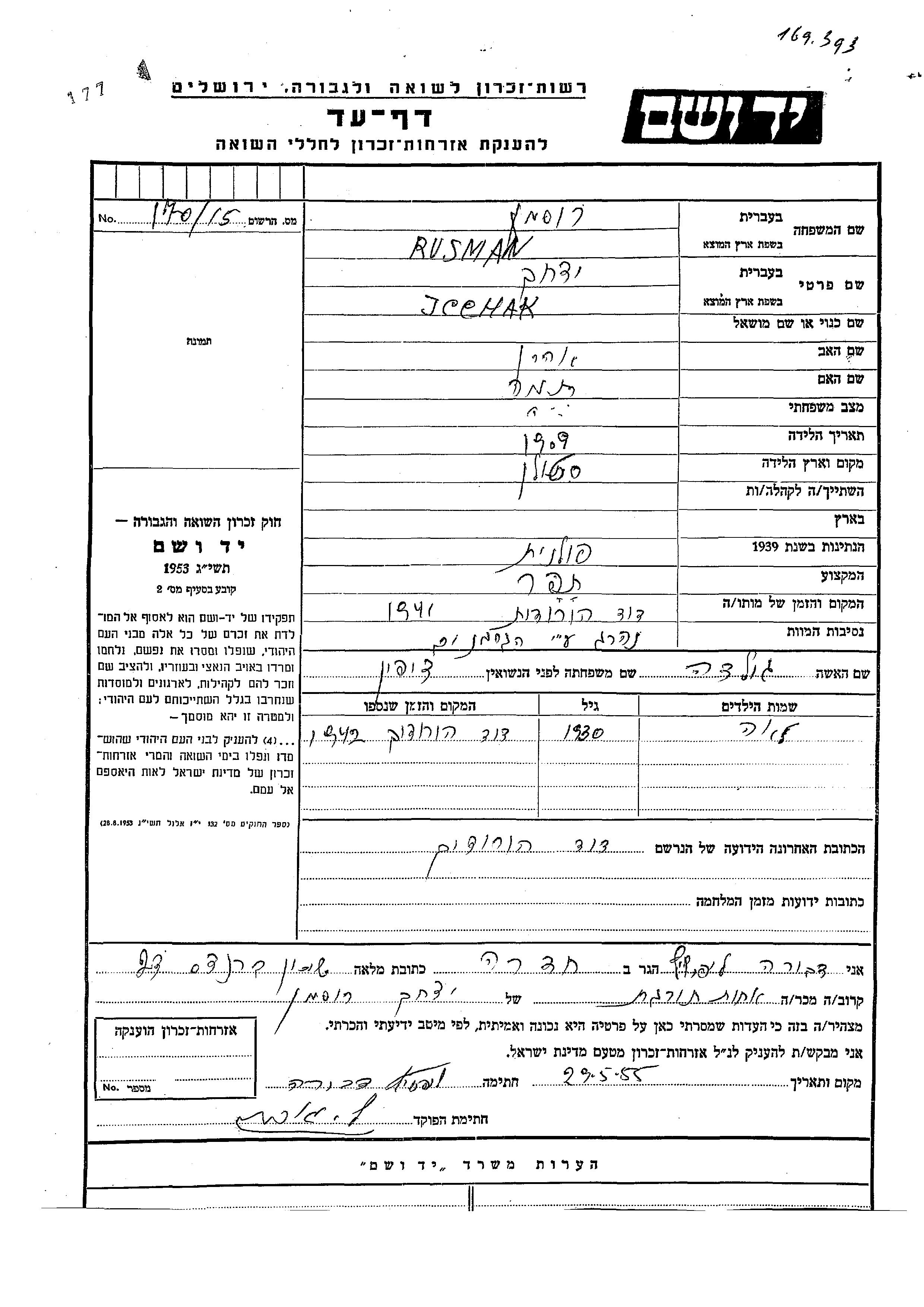 Jcchak Rusman Rosman wurde im Jahr 1909 in Stolin, Polen geboren. Er war der Sohn von Aharon und Tama. Er war Näher und mit Golda, geb. Tzipin Verheiratet. Während des Krieges war er in Dod Horodok, Polen.