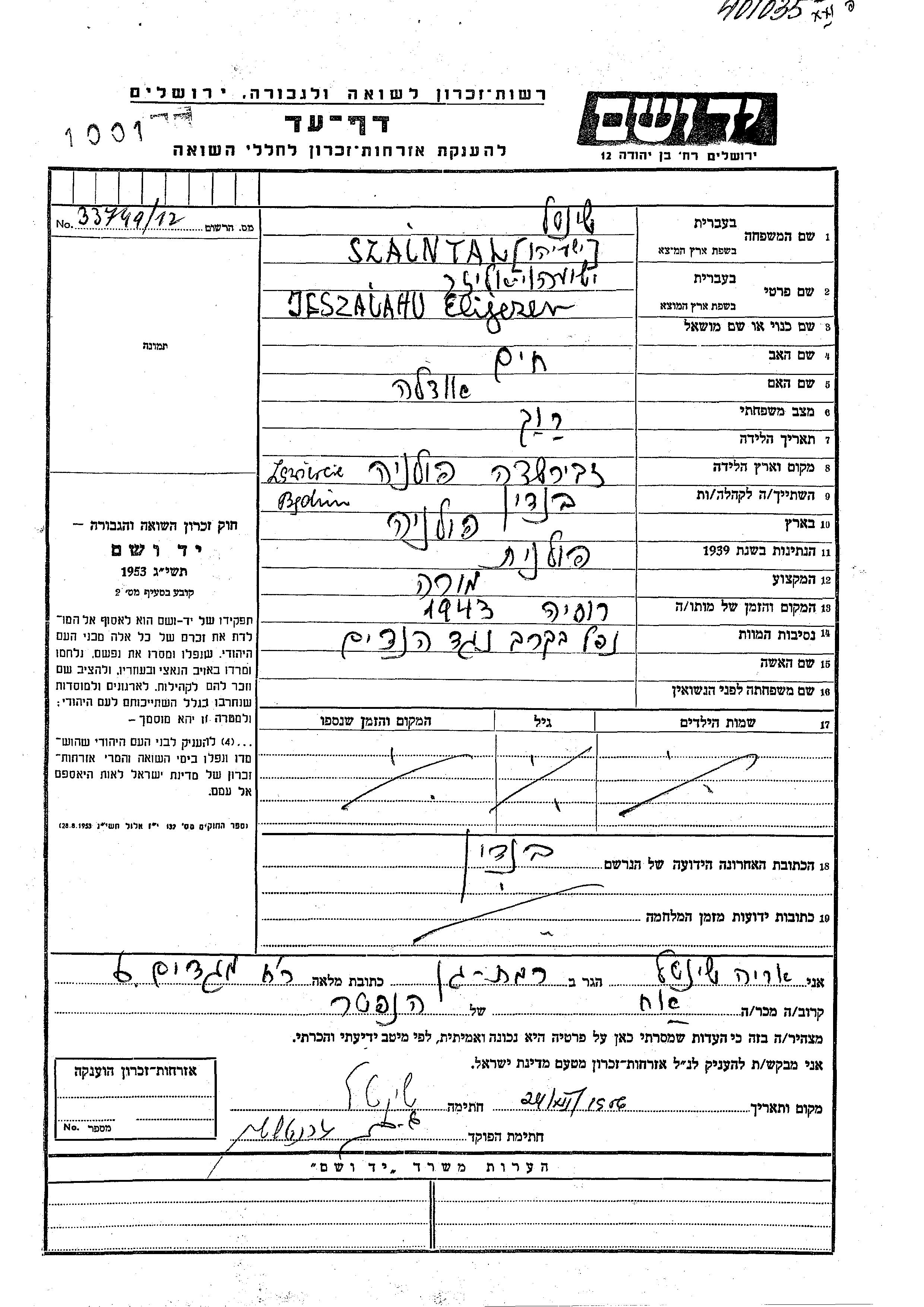 Yeszaiahu Elijezer wurde in der Schoah ermordet. Todesort: Russland (UdSSR) im Jahr 1943.