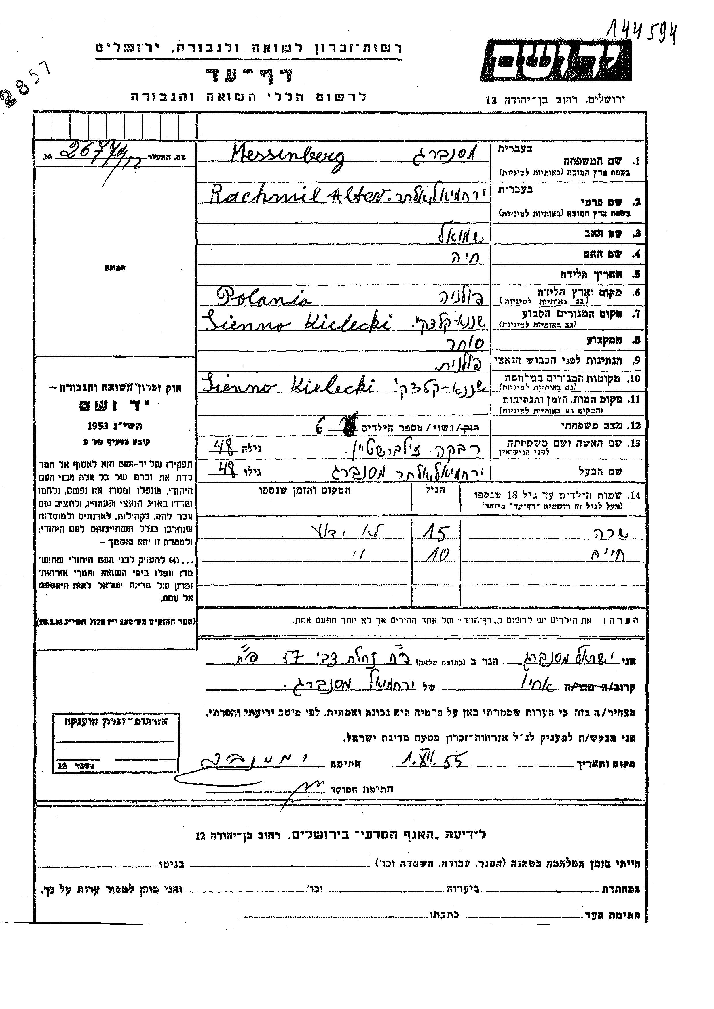 Rachmiel Alter Messenberg wurde in Polen geboren. Er war der Sohn von Shmuel und Khaia. Er war Kaufmann/-frau und mit Rivka, geb. Zilbershtein Verheiratet. Vor dem Zweiten Weltkrieg lebte er in Sienno, Polen. Während des Krieges war er in Sienno, Polen.