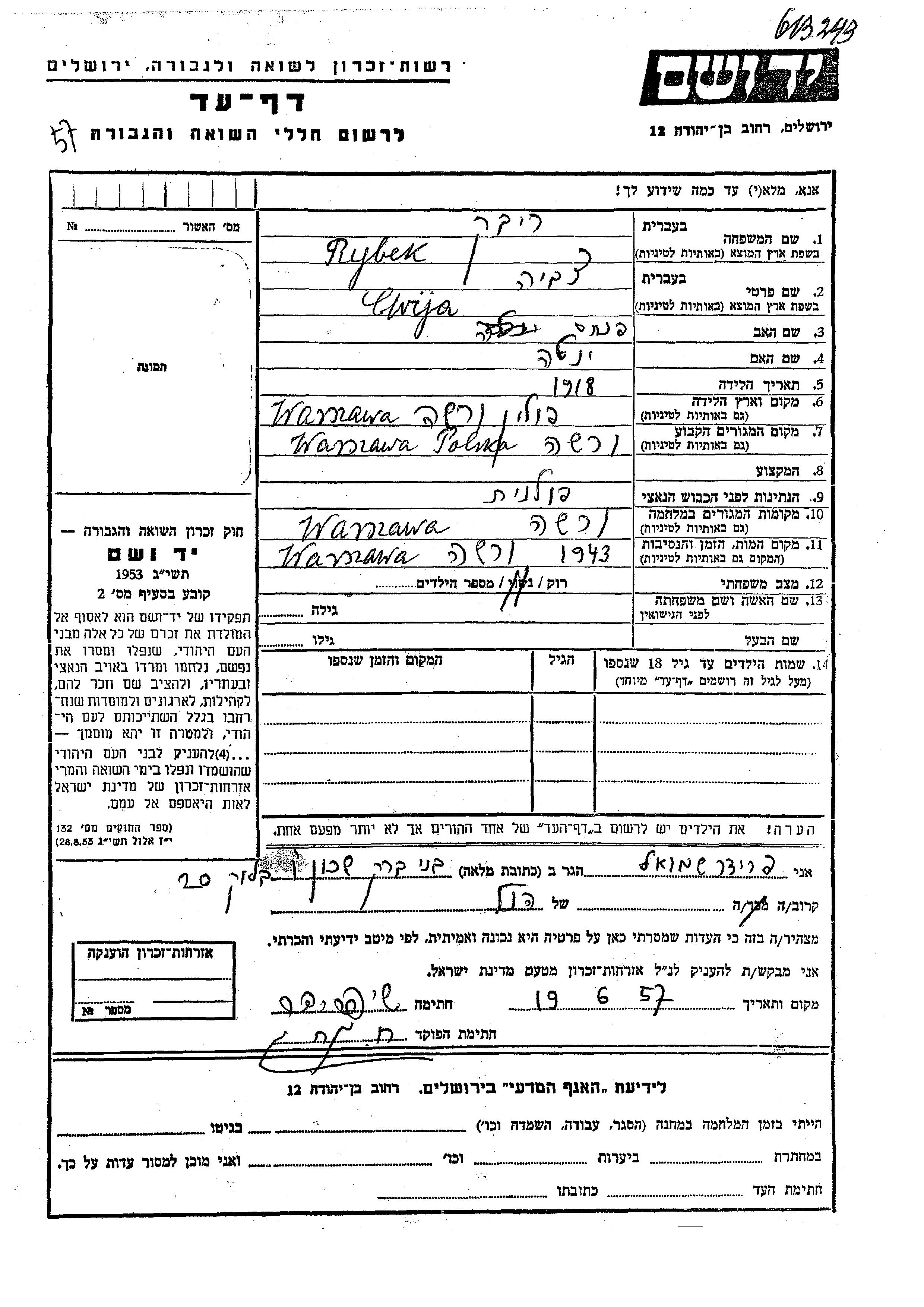 Cwija Rybek wurde im Jahr 1918 in Warszawa, Polen geboren. Sie war die Tochter von Pinkhas und Yenta. Vor dem Zweiten Weltkrieg lebte sie in Warszawa, Polen. Während des Krieges war sie in Warszawa, Polen.