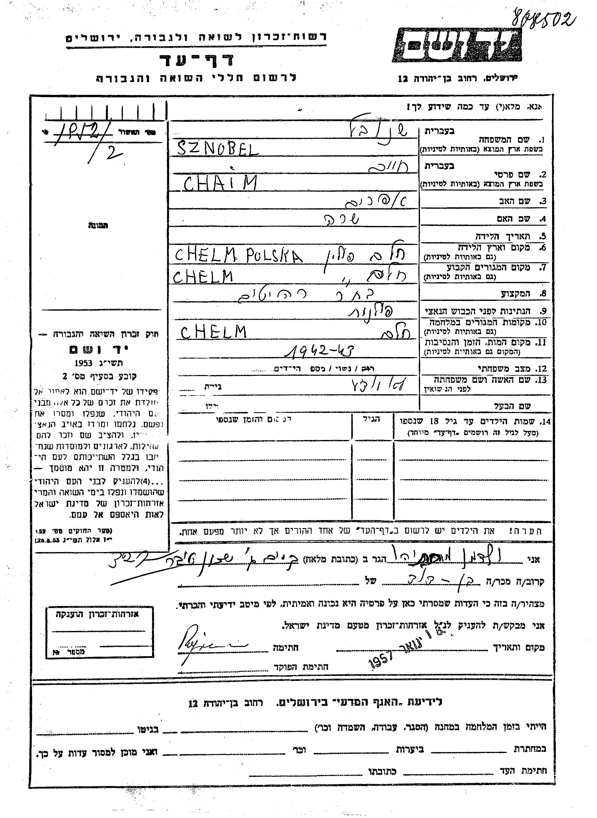 Chaim Sznobel wurde in Chelm, Polen geboren. Er war der Sohn von Efraim und Sara. Vor dem Zweiten Weltkrieg lebte er in Chelm, Polen. Während des Krieges war er in Chelm, Polen.