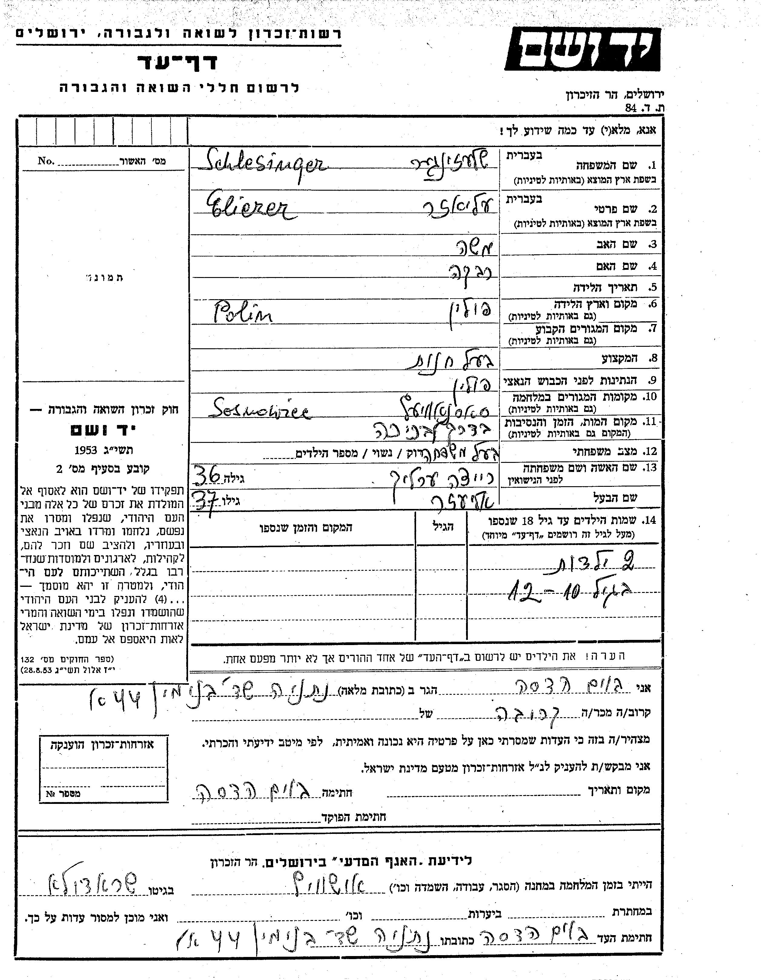 Eliezer Schlesinger wurde in Polen geboren. Er war der Sohn von Moshe und Rivka. Er war Ladenbesitzer/-in und mit Raicha, geb. Erlikh Verheiratet. Vor dem Zweiten Weltkrieg lebte er in Sosnowic, Polen. Während des Krieges war er in Sosnowic, Polen.