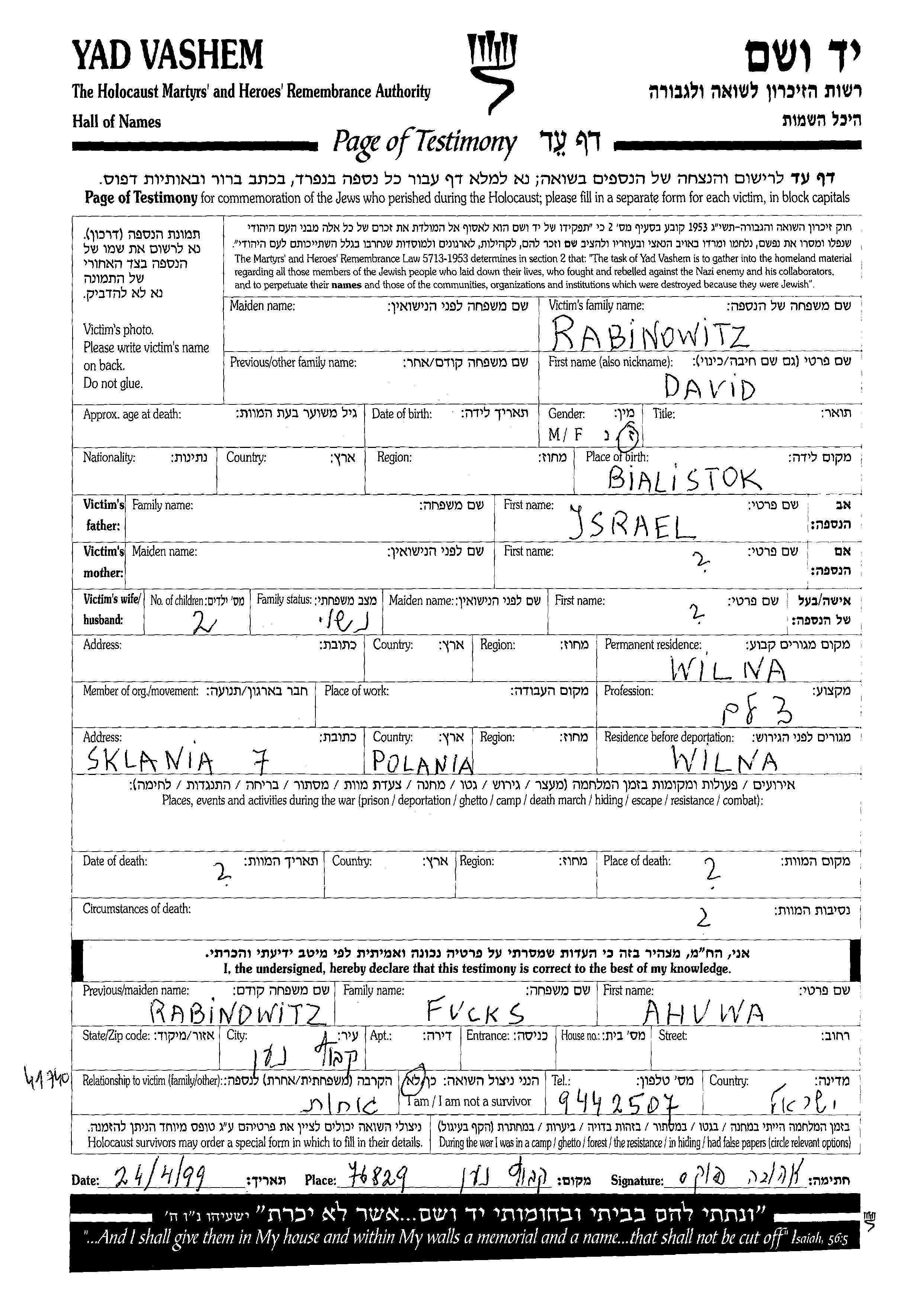 David Rabinowitz wurde in Bialistok, Polen geboren. Er war der Sohn von Israel. Er war Fotograf/-in und Verheiratet. Vor dem Zweiten Weltkrieg lebte er in Wilna, Polen. Während des Krieges war er in Wilna, Polen.