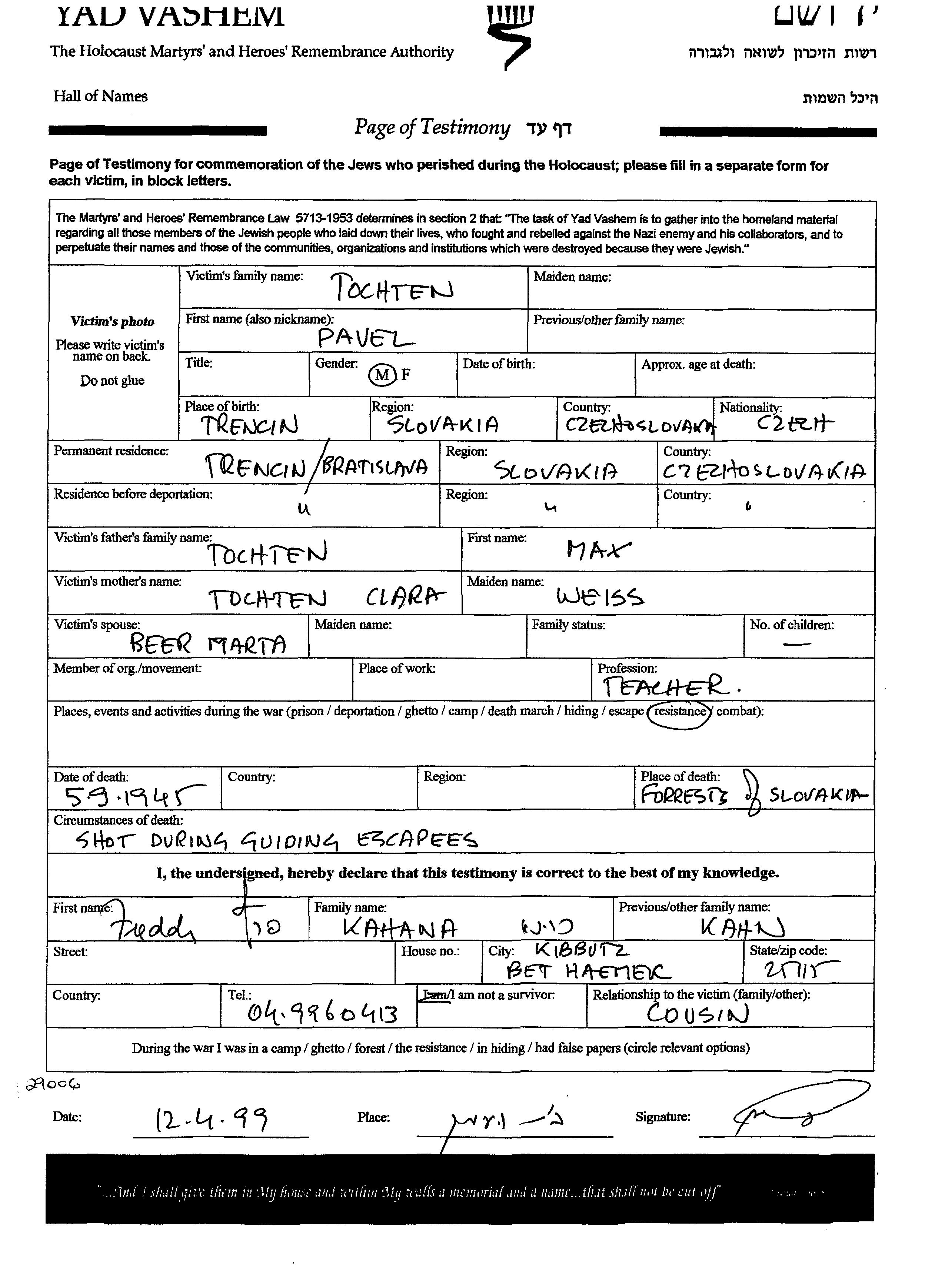 Pavel Tochten wurde in Trencin, Tschechoslowakei geboren. Er war der Sohn von Max und Clara. Er war Lehrer/in und mit Marta, geb. Beer Verheiratet. Vor dem Zweiten Weltkrieg lebte er in Trencin, Tschechoslowakei. Während des Krieges war er in Trencin, Tschechoslowakei.