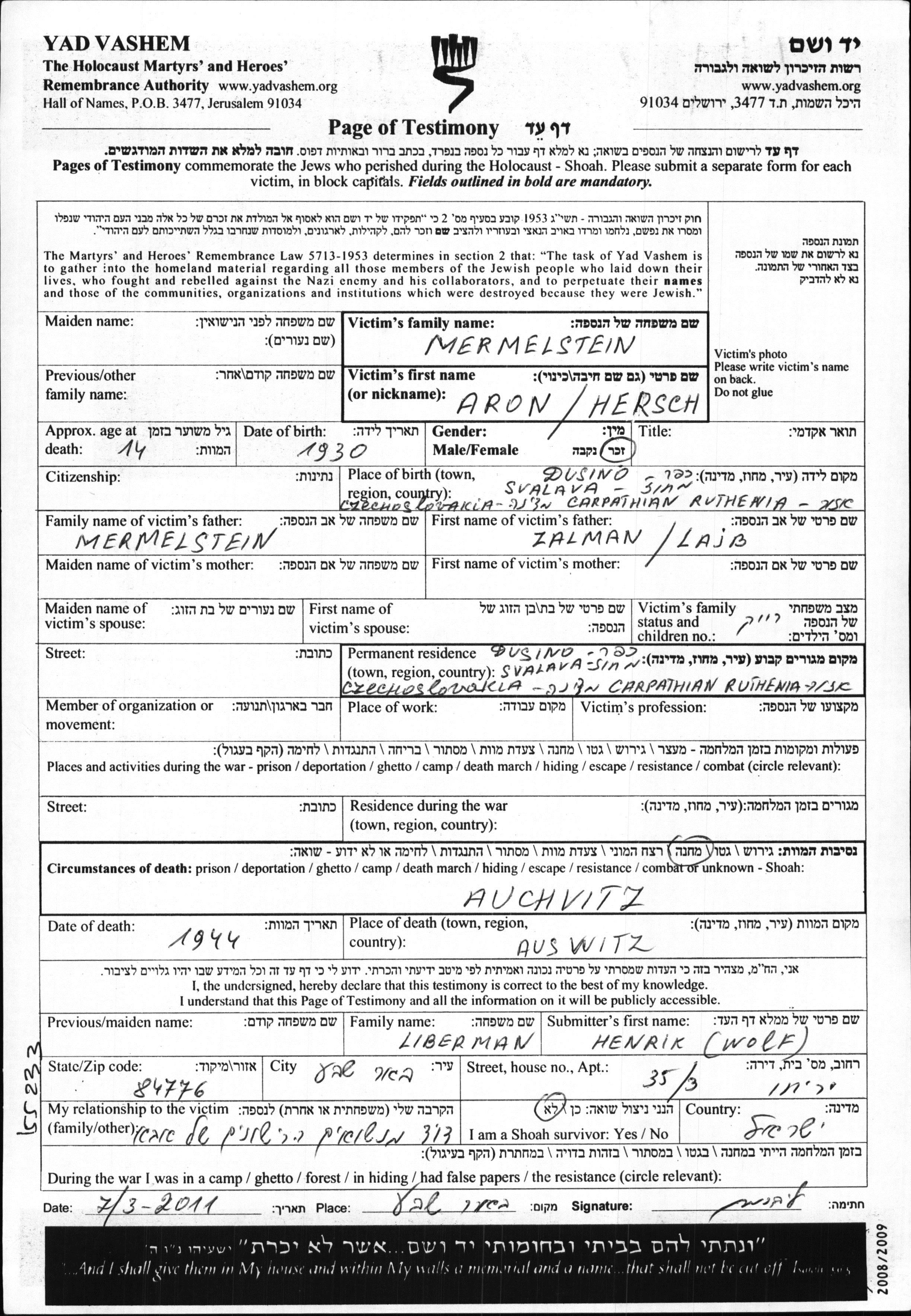 Aron Hersch Mermelstein wurde im Jahr 1930 in Dusino, Tschechoslowakei geboren. Er war der Sohn von Zalman Lajb. Er war Jugendliche/-r. Vor dem Zweiten Weltkrieg lebte er in Dusino, Tschechoslowakei. Während des Krieges war er in Carpathian Ruthenia, Tschechoslowakei.