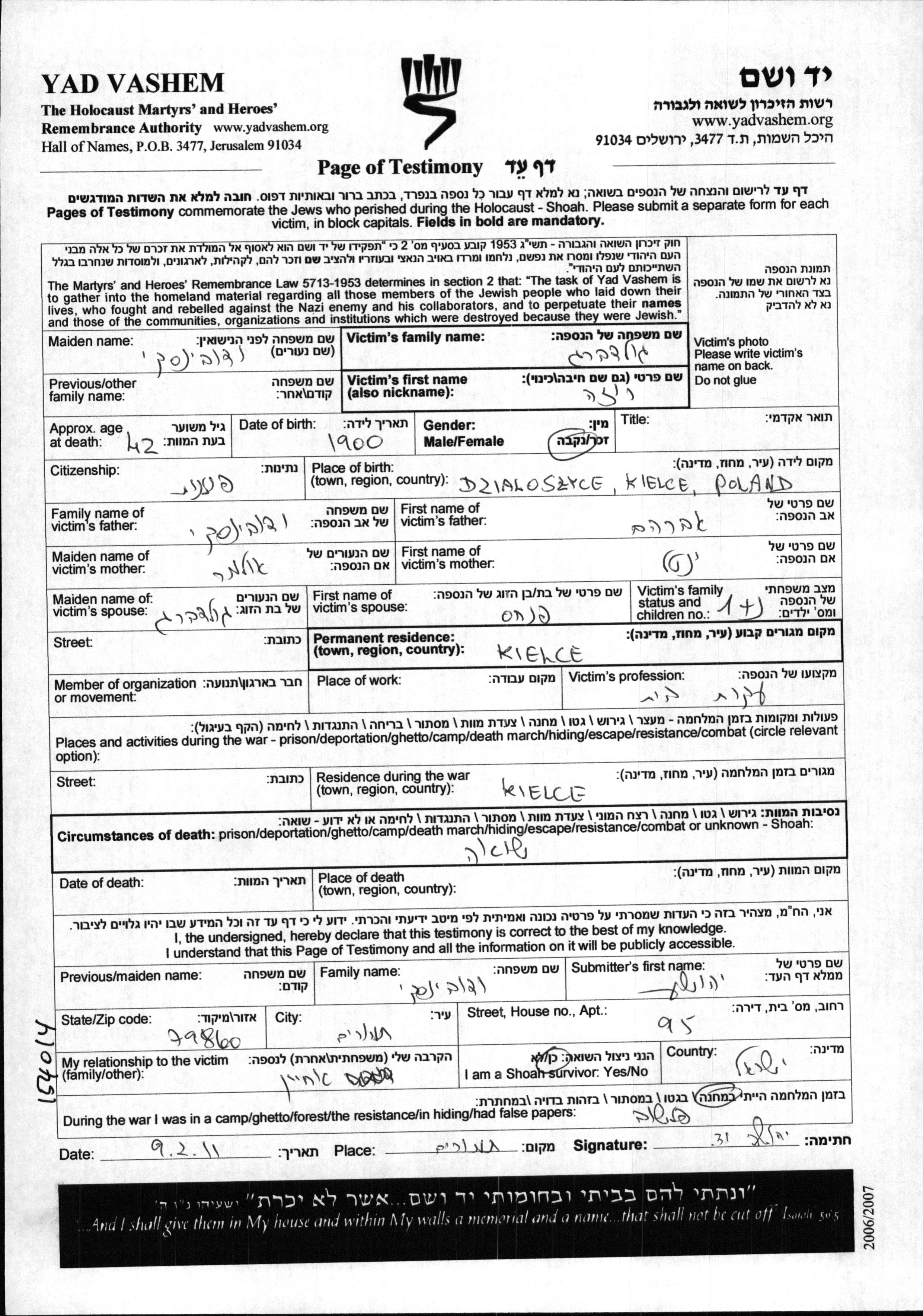 Roza Goldberg, geb. Vdovinski wurde im Jahr 1900 in Dzialoszyce, Polen geboren. Sie war die Tochter von Avraham und Yentl, geb. Olmer. Sie war Hausfrau und mit Pinkhas, geb. Goldberg Verheiratet. Vor dem Zweiten Weltkrieg lebte sie in Kielce, Polen. Während des Krieges war sie in Kielce, Polen. Roza wurde in der Schoah ermordet.