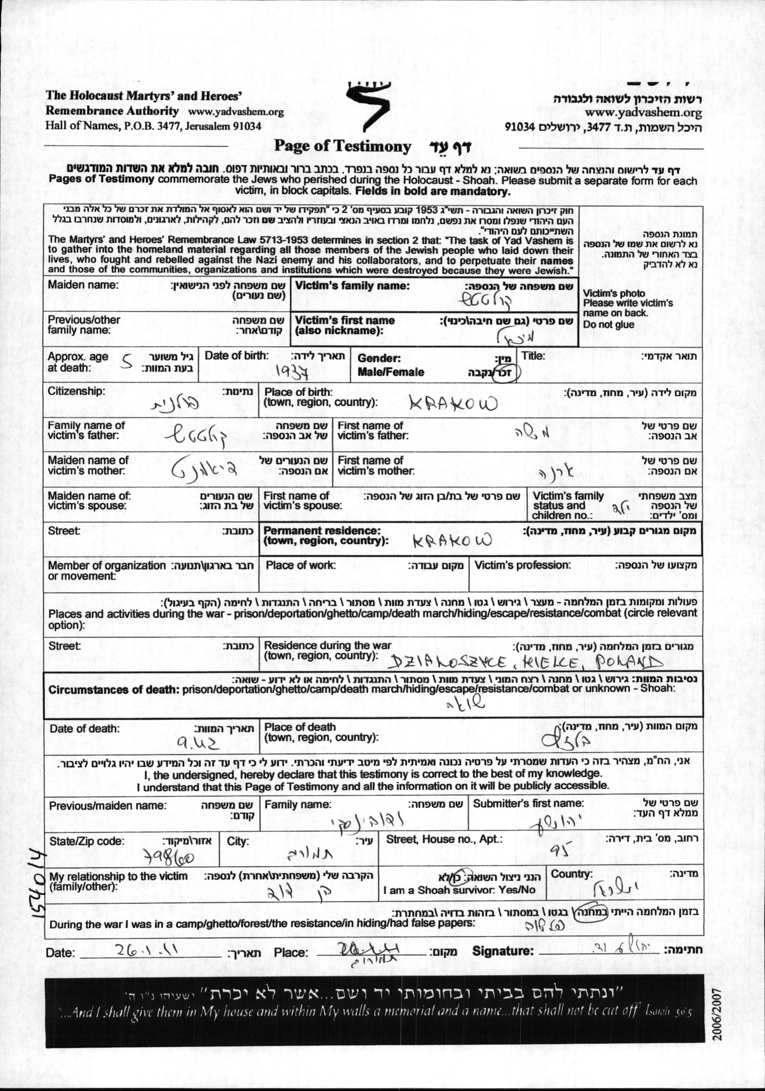 Mikhael Kolatach wurde im Jahr 1937 in Krakow, Polen geboren. Er war der Sohn von Moshe und Erna, geb. Diamant. Er war Kind. Vor dem Zweiten Weltkrieg lebte er in Krakow, Polen. Während des Krieges war er in Dzialoszyce, Polen. Mikhael wurde in der Schoah ermordet. Todesort: Belzec, Polen im Jahr 09/1942.