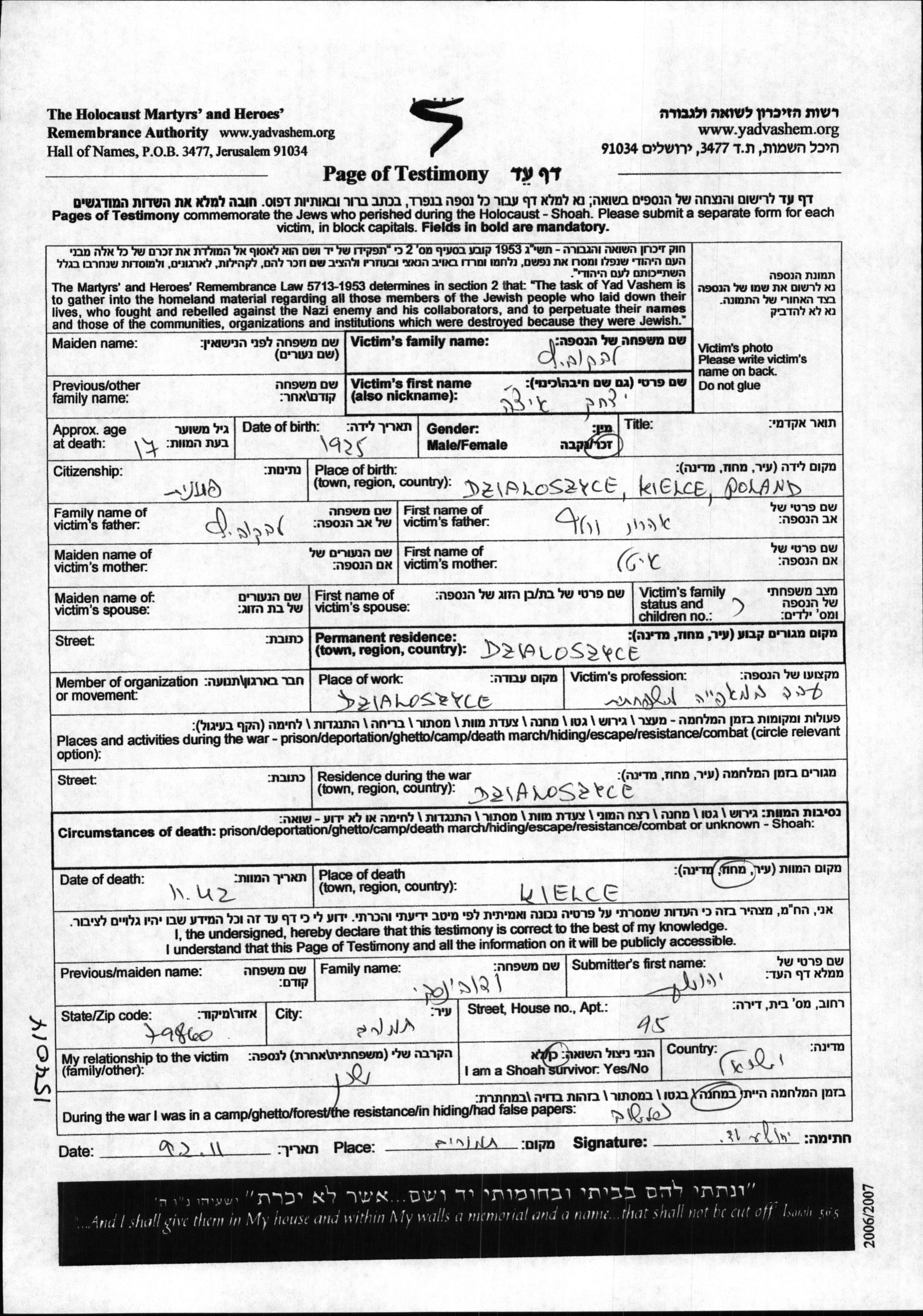 Yitzkhak Levkovitz wurde im Jahr 1925 in Dzialoszyce, Polen geboren. Er war der Sohn von Aharon Volf und Itel. Er war Jugendliche/-r. Vor dem Zweiten Weltkrieg lebte er in Dzialoszyce, Polen. Während des Krieges war er in Dzialoszyce, Polen. Yitzkhak wurde in der Schoah ermordet. Todesort: Kielce, Polen im Jahr 11/1942.