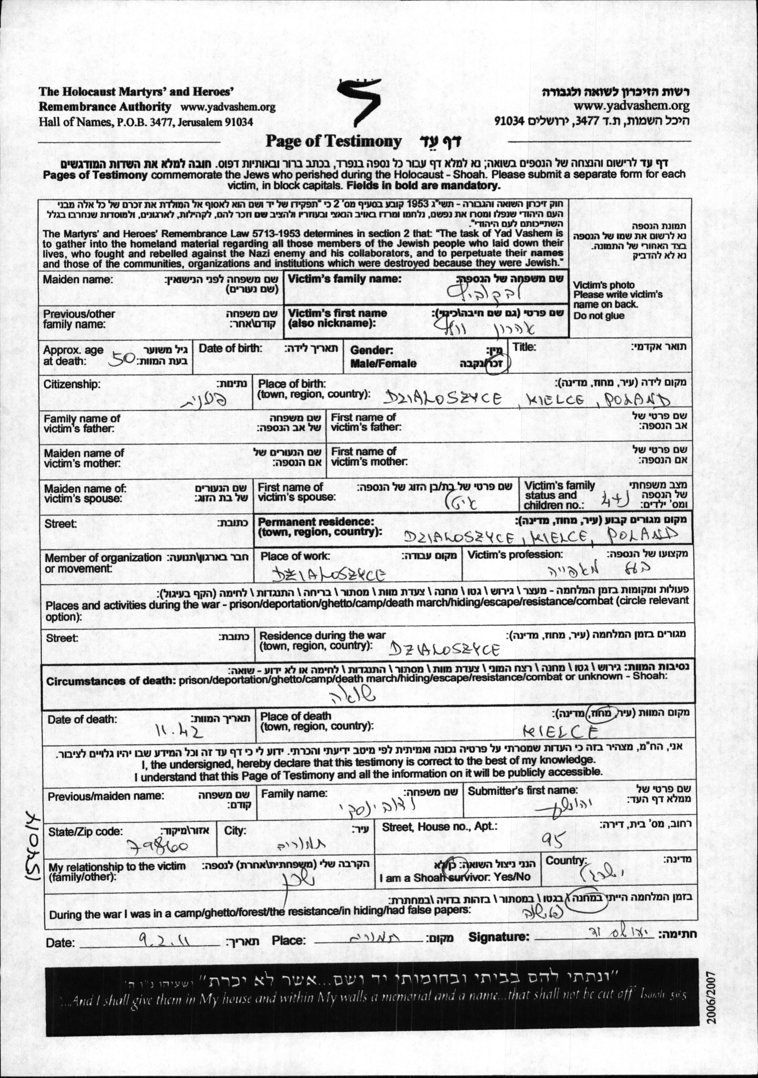 Aharon Volf Levkovitz wurde in Dzialoszyce, Polen geboren. Er war Besitzer einer bäckerei und mit Itel Verheiratet. Vor dem Zweiten Weltkrieg lebte er in Dzialoszyce, Polen. Während des Krieges war er in Dzialoszyce, Polen. Aharon Volf wurde in der Schoah ermordet. Todesort: Kielce, Polen im Jahr 11/1942.
