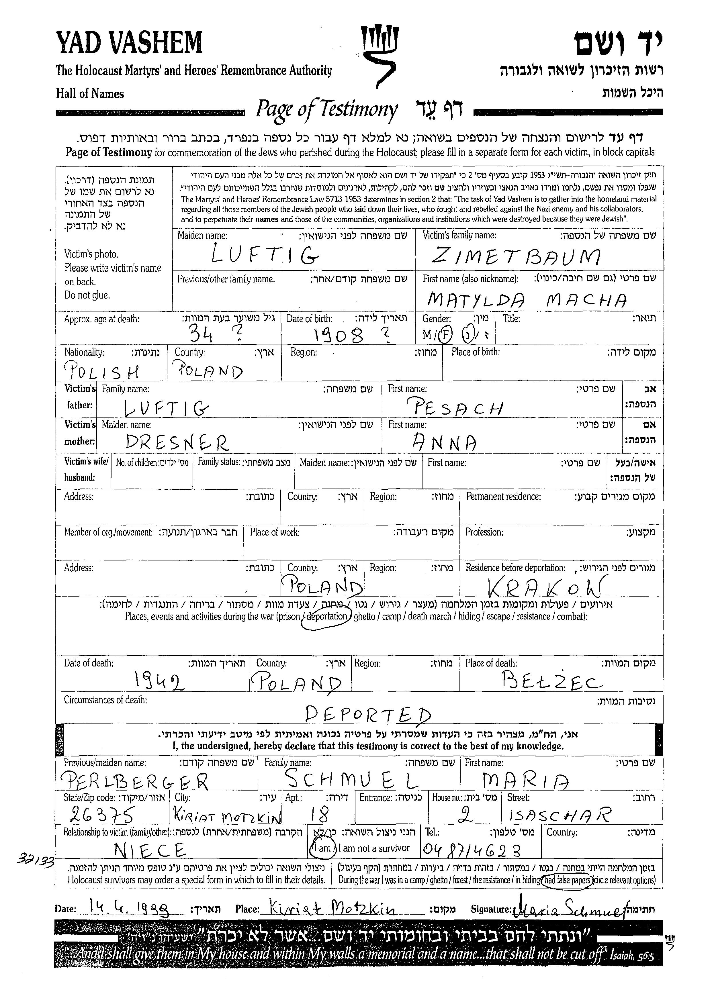 Matylda Macha Zimetbaum, geb. Luftig wurde im Jahr 1908 in Polen geboren. Sie war die Tochter von Pesach und Panna. Während des Krieges war sie in Krakow, Polen.