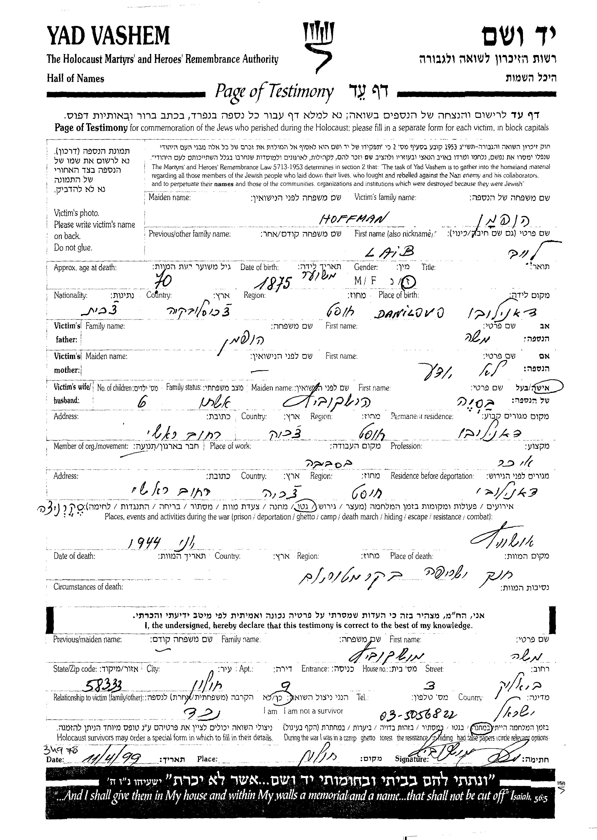 Laib Hoffman wurde im Jahr 1875 in Danilovo, Tschechoslowakei geboren. Er war der Sohn von Moshe. Er war Bauer/bäuerin und mit Basia, geb. Hershkovitz Verheiratet. Vor dem Zweiten Weltkrieg lebte er in Danilovo, Tschechoslowakei. Während des Krieges war er in Danilovo, Tschechoslowakei.