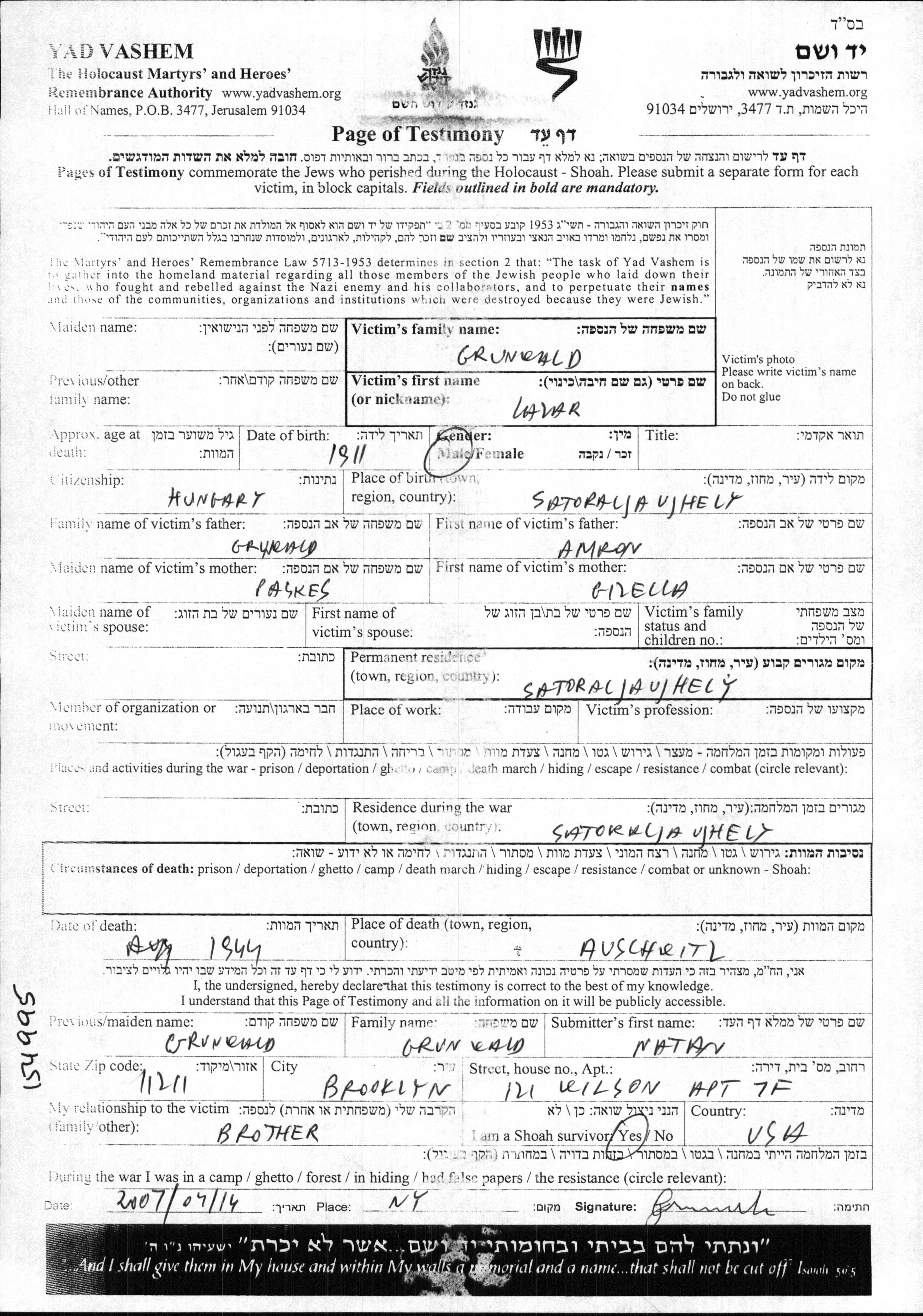 Lazar Grunwald wurde im Jahr 1911 in Satoraljaujhely, Ungarn geboren. Er war der Sohn von Amron und Gizella, geb. Paskes. Vor dem Zweiten Weltkrieg lebte er in Satoraljaujhely, Ungarn. Während des Krieges war er in Satoraljaujhely, Ungarn.