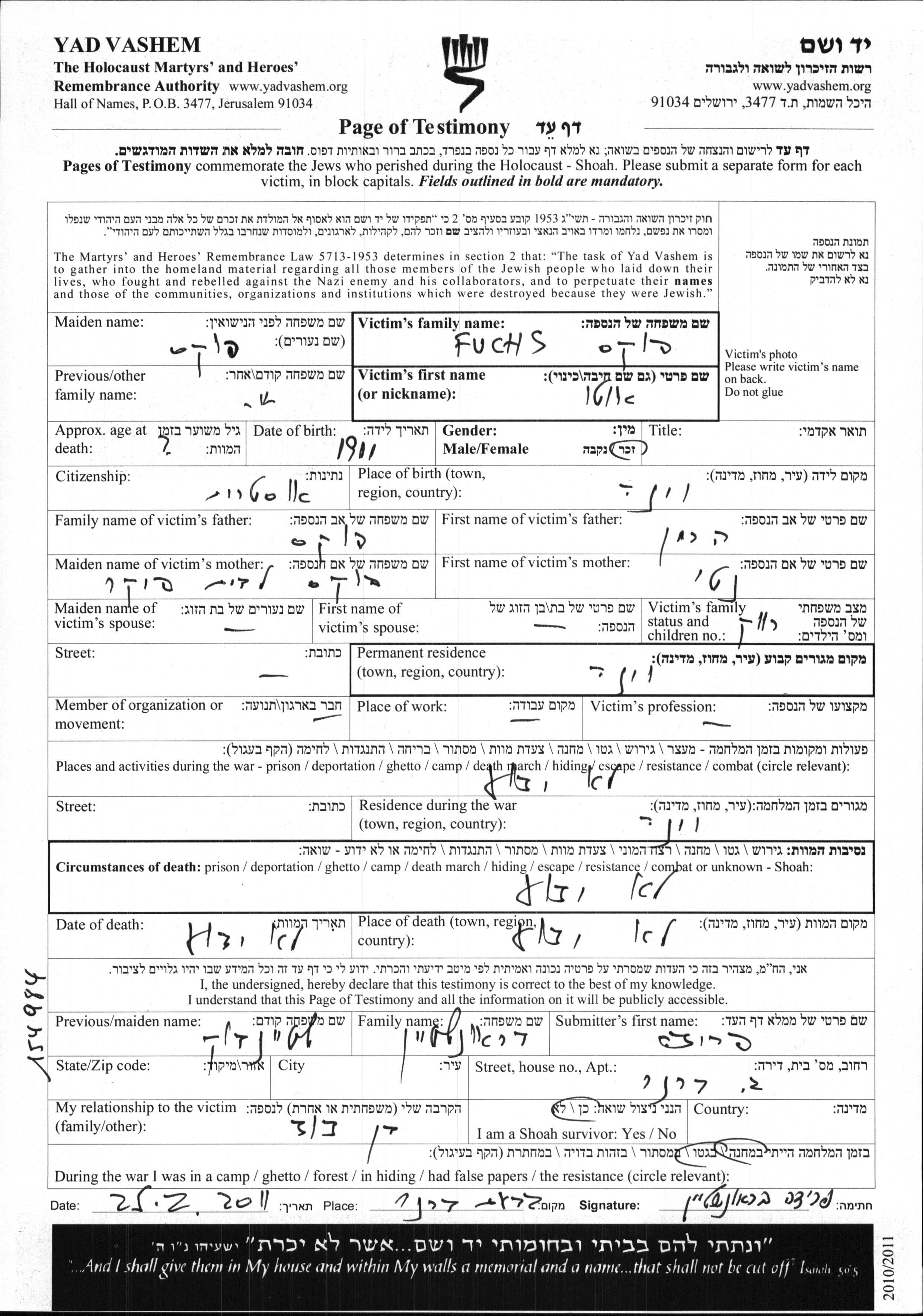 Otto Fuchs wurde im Jahr 1911 in Wien, Österreich geboren. Er war der Sohn von Herman und Neti, geb. Pikar. Er war Ledig. Vor dem Zweiten Weltkrieg lebte er in Wien, Österreich.