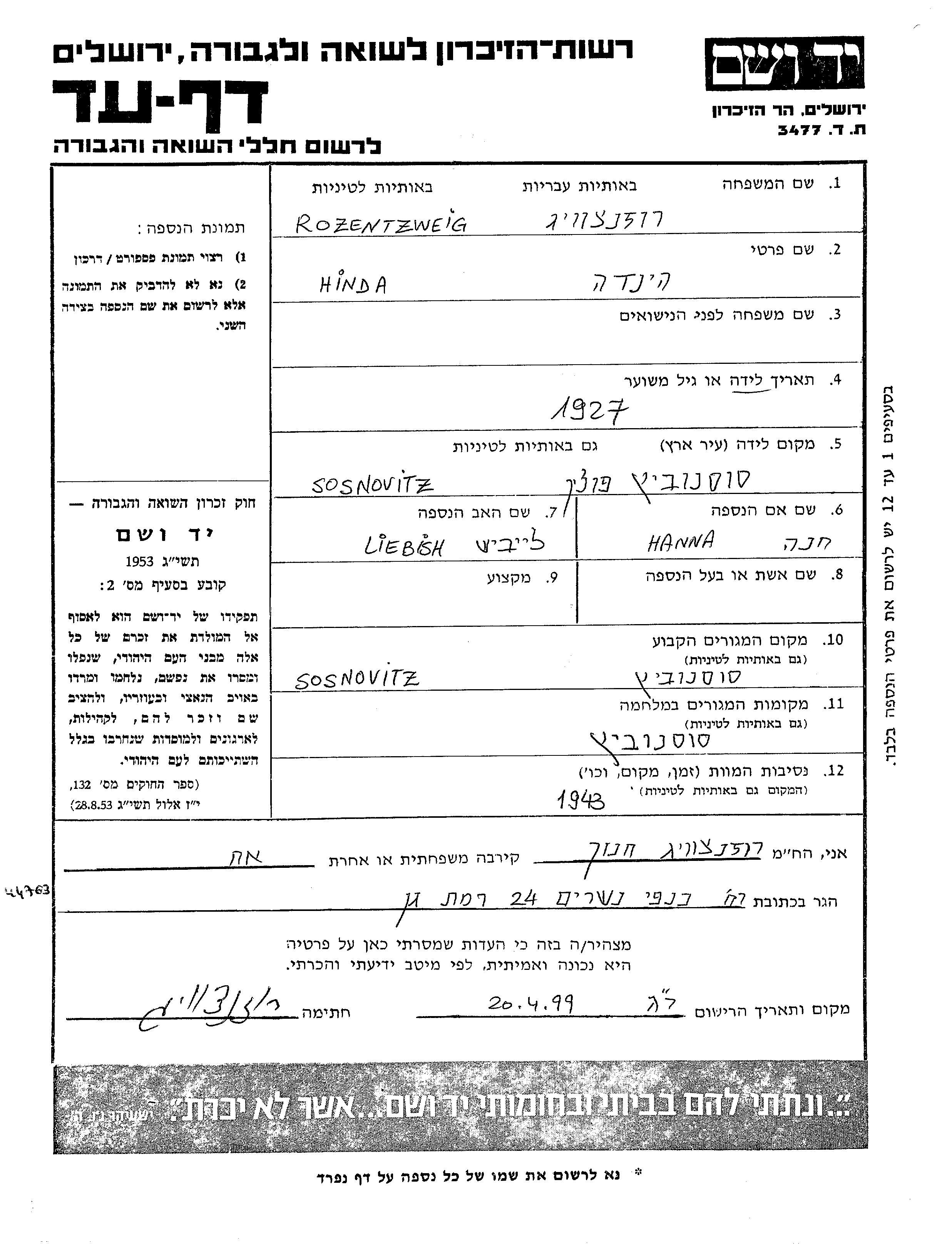 Rozentzweig Hinda 1927 Sosnowitz, Polen Gedenkblatt