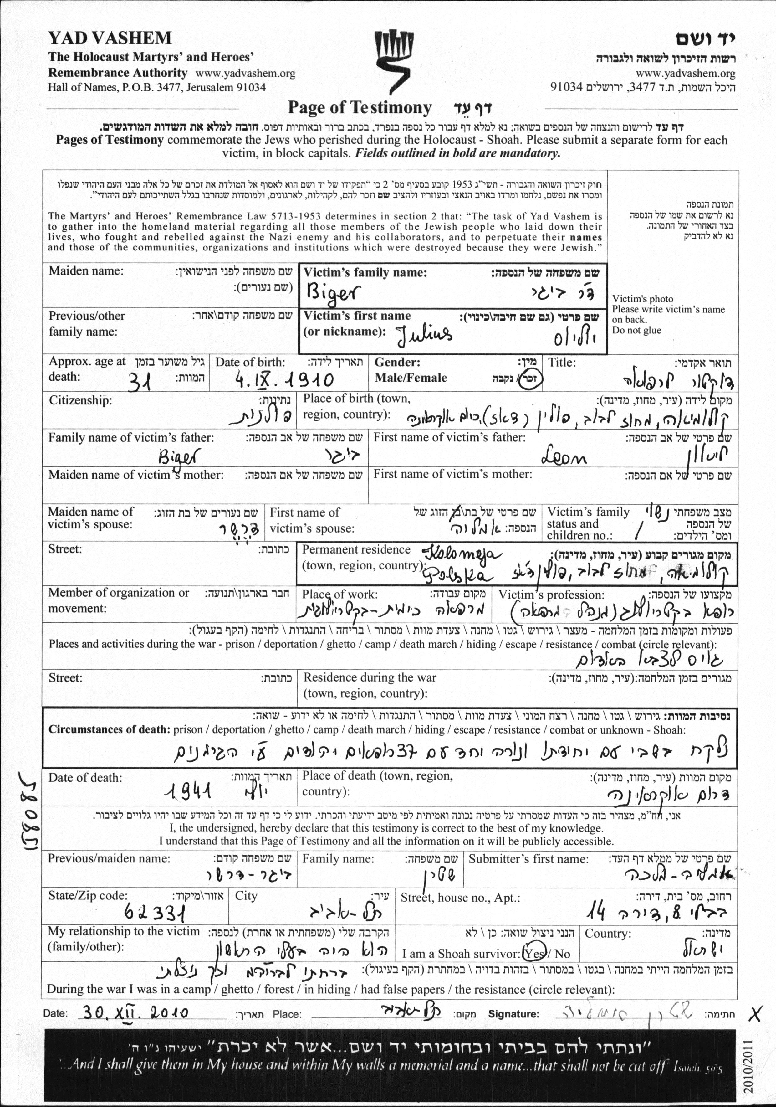 Julius Biger wurde im Jahr 1910 in Kolomeja, Polen geboren. Er war der Sohn von Leon. Er war Bakteriolog und mit Amalia, geb. Dresher Verheiratet. Vor dem Zweiten Weltkrieg lebte er in Kolomeja, Polen. Während des Krieges war er in die Sowjetischen Streitkräfte.