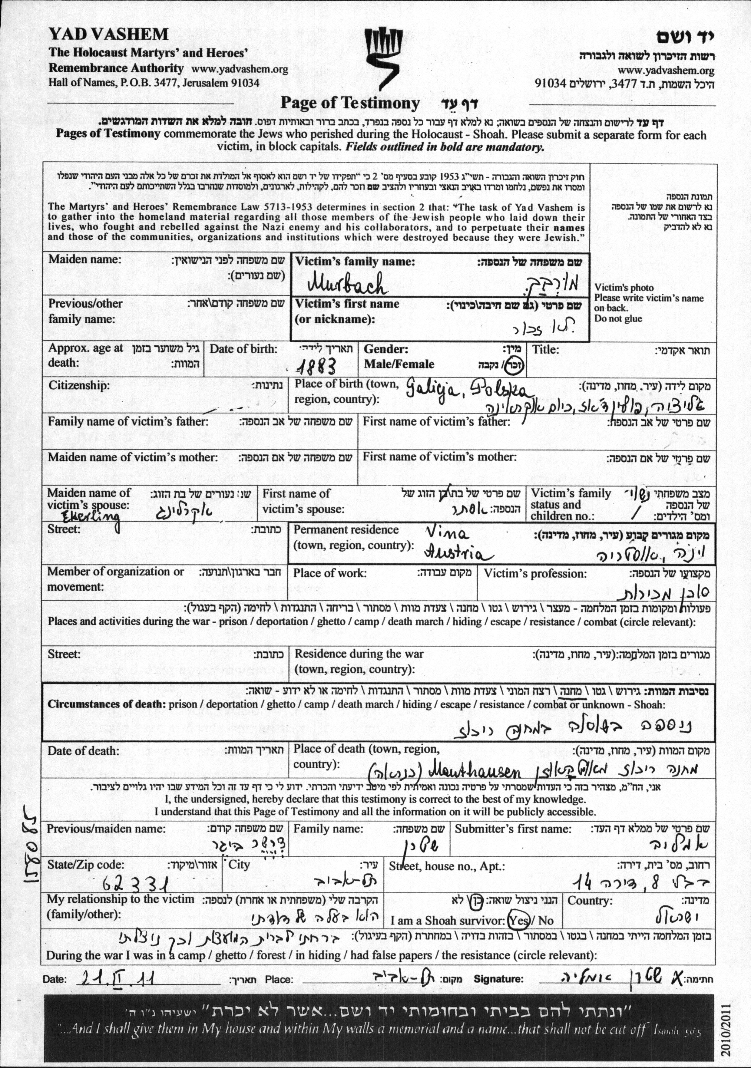 Vorname unbekannt Murbach wurde im Jahr 1883 in Galizien Region, Polen geboren. Er war Handelsvertreter und mit Ester, geb. Ekerling Verheiratet. Vor dem Zweiten Weltkrieg lebte er in Vina, Österreich.