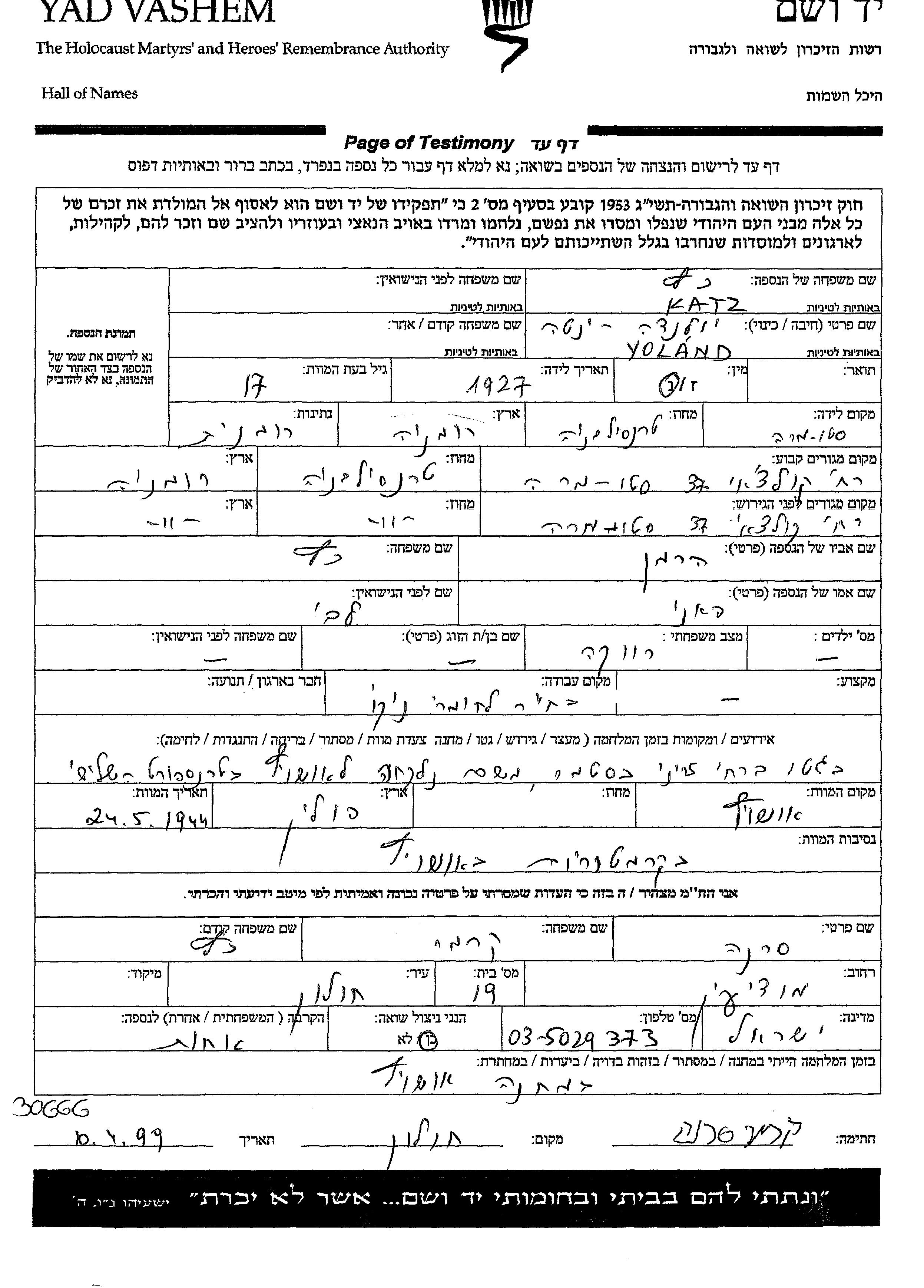 Yoland Yenta Katz wurde im Jahr 1927 in Satomare, Rumänien geboren. Sie war die Tochter von Herman und Fani. Sie war Ledig. Vor dem Zweiten Weltkrieg lebte sie in Satomare, Rumänien. Während des Krieges war sie in Satomare, Rumänien.