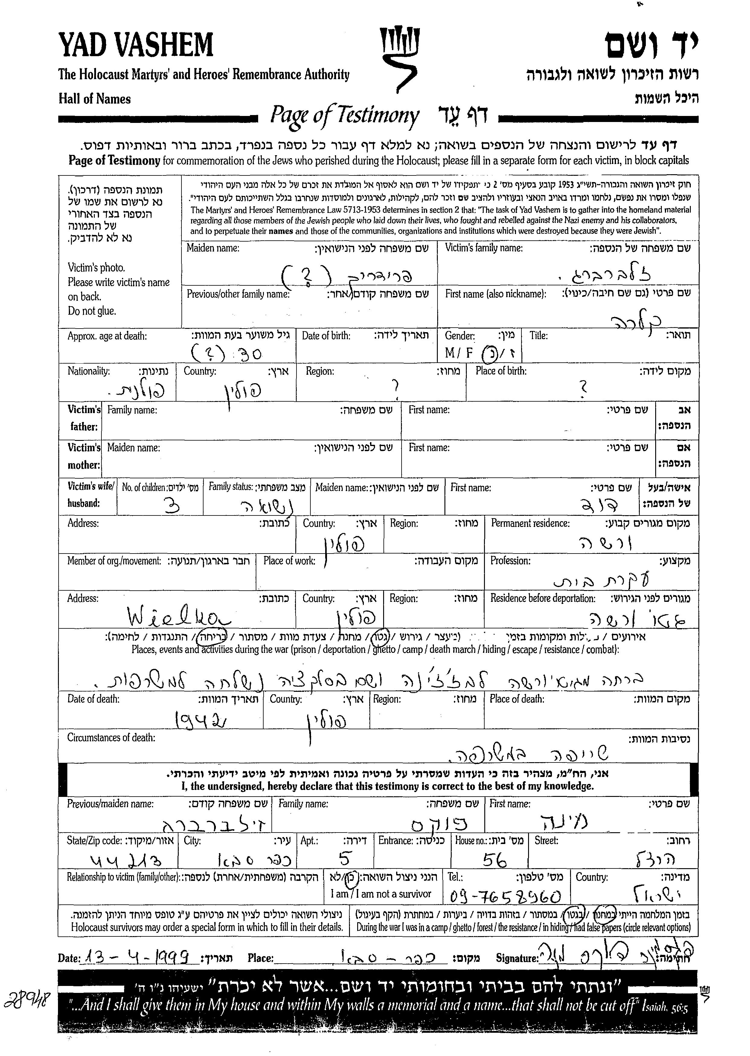 Klara Zilberberg, geb. Fridrikh wurde in Polen geboren. Sie war Hausfrau und mit David Verheiratet. Vor dem Zweiten Weltkrieg lebte sie in Warschau, Polen. Während des Krieges war sie in Warschau, Polen.