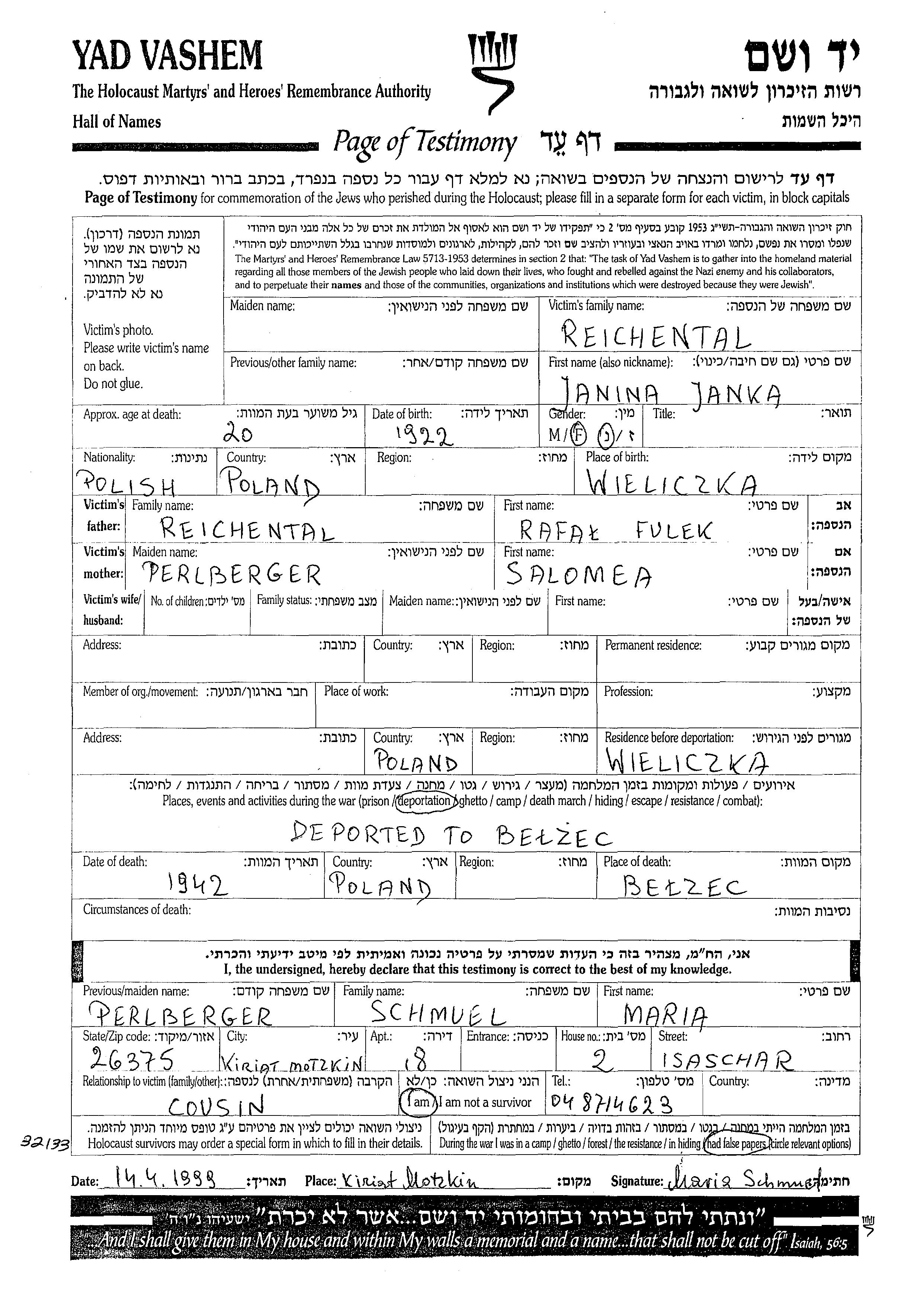 Yanina Janka Reichental wurde im Jahr 1922 in Wieliczka, Polen geboren. Sie war die Tochter von Rafal und Salomea. Während des Krieges war sie in Wieliczka, Polen.
