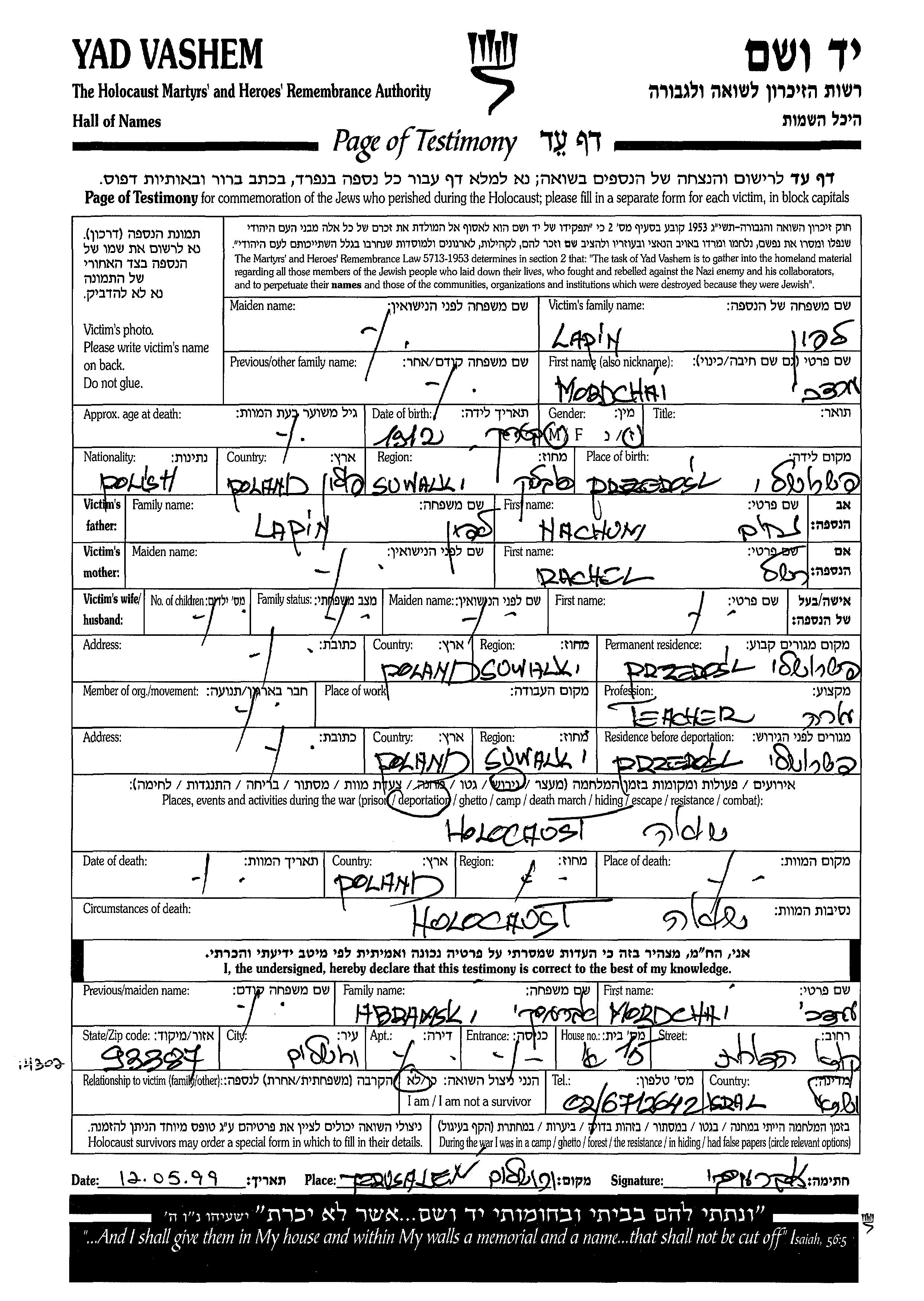 Mordchai Lapin wurde im Jahr 1912 in Suwalki, Polen geboren. Er war der Sohn von Nachom und Rachel. Er war Lehrer/in. Vor dem Zweiten Weltkrieg lebte er in Suwalki, Polen. Während des Krieges war er in Suwalki, Polen.
