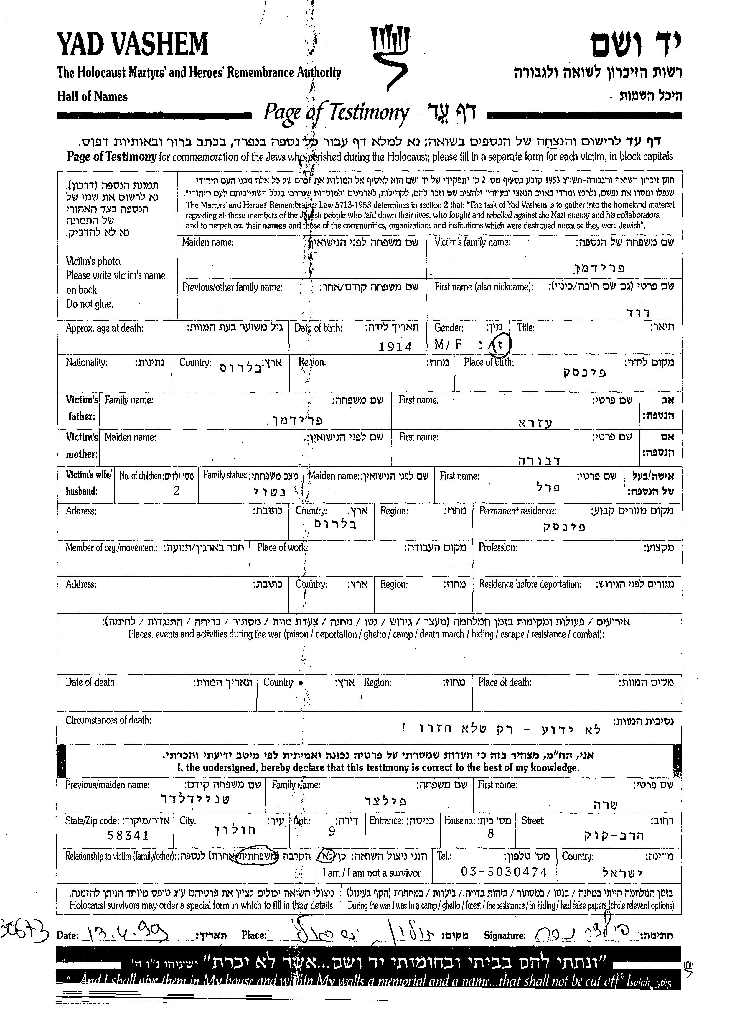 Fridman David 1914 Pinsk, Polen Gedenkblatt