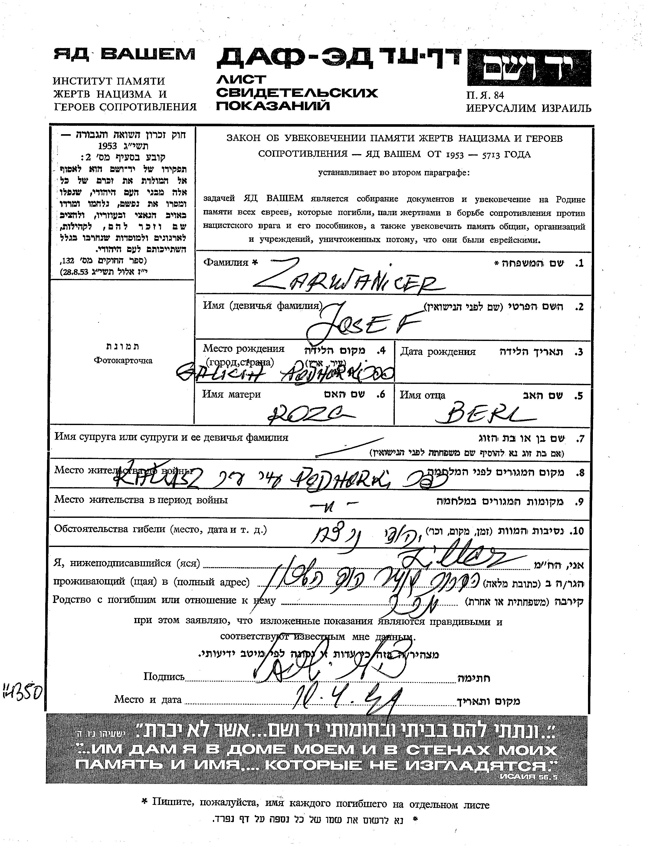 Josef Zarwanicer wurde in Podhorki, Polen geboren. Er war der Sohn von Berl und Roza. Vor dem Zweiten Weltkrieg lebte er in Podhorki, Polen. Während des Krieges war er in Podhorki, Polen.
