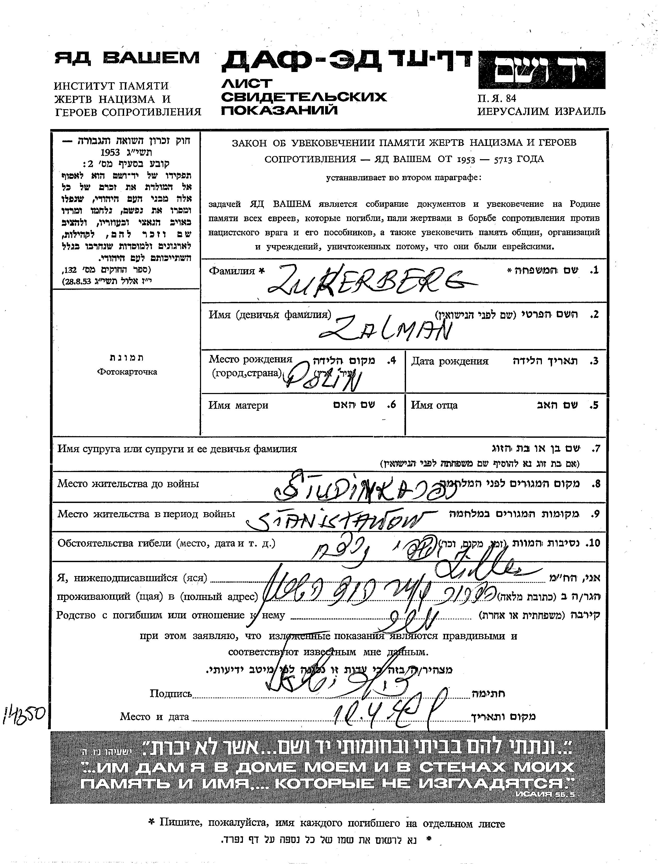 Zalman wurde in der Schoah ermordet.