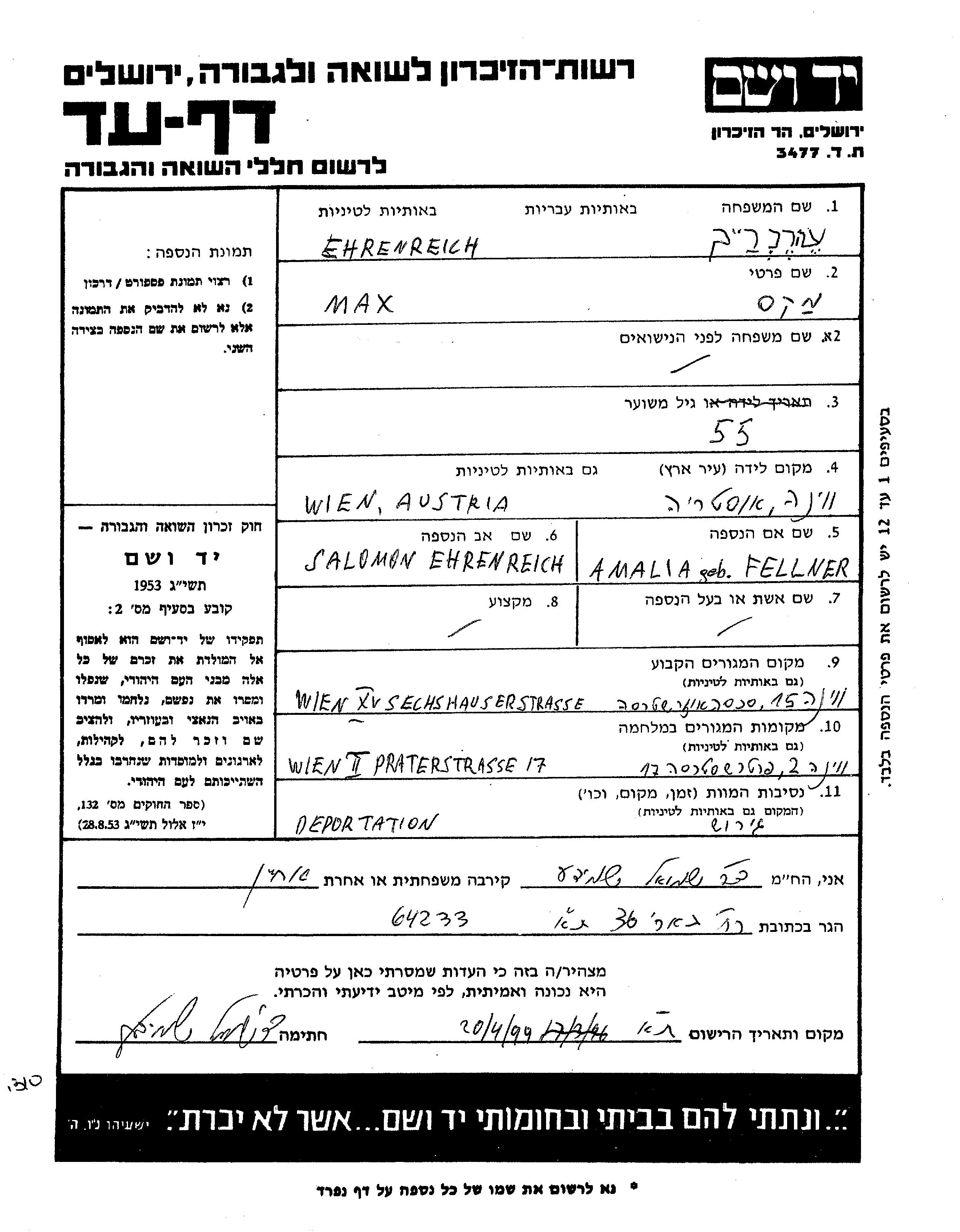 Max Erenreykh wurde in Vienna, Österreich geboren. Er war der Sohn von Salomon und Amalia. Vor dem Zweiten Weltkrieg lebte er in Vienna, Österreich. Während des Krieges war er in Vienna, Österreich.