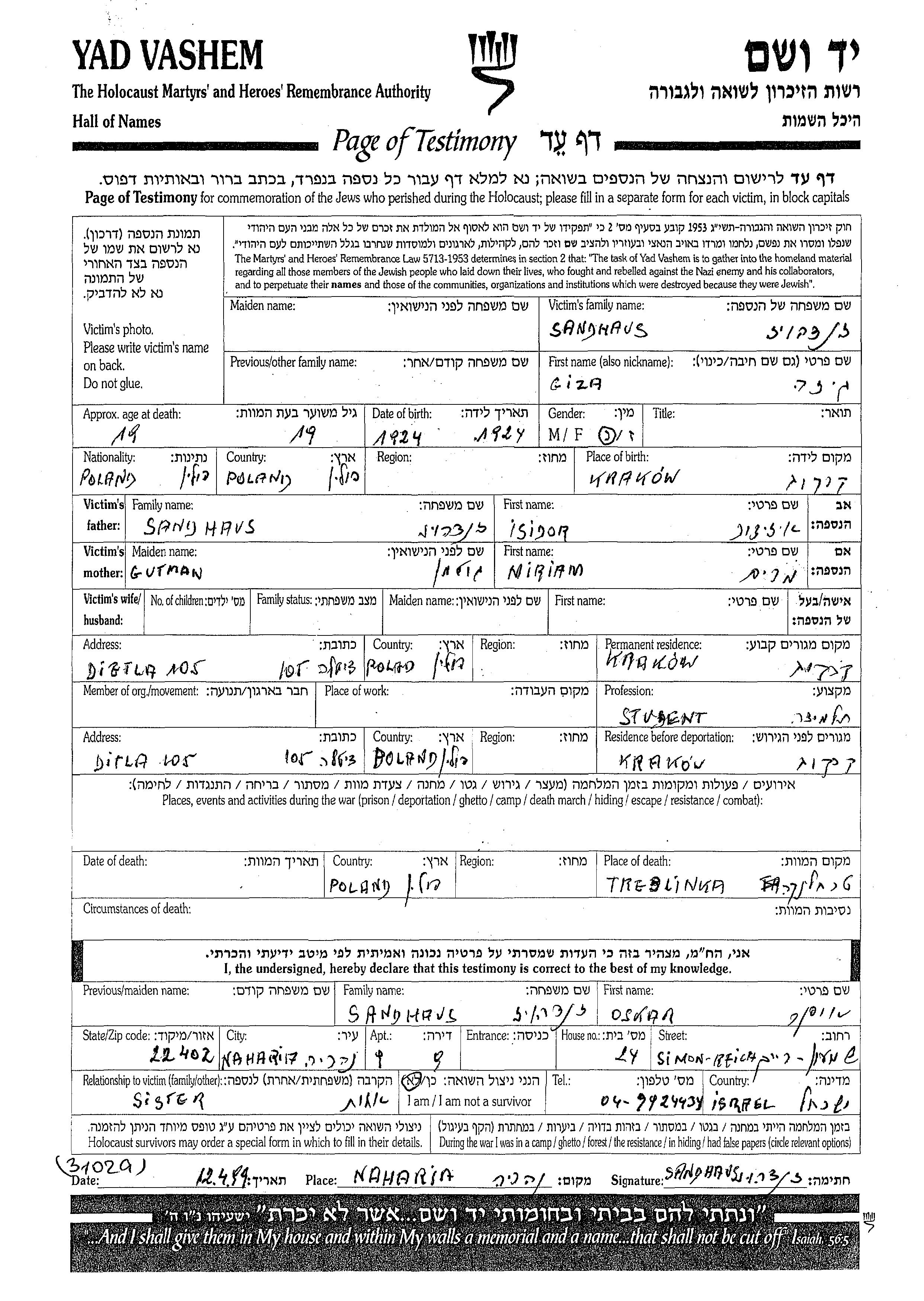 Giza wurde in der Schoah ermordet. Todesort: Treblinka, Polen.