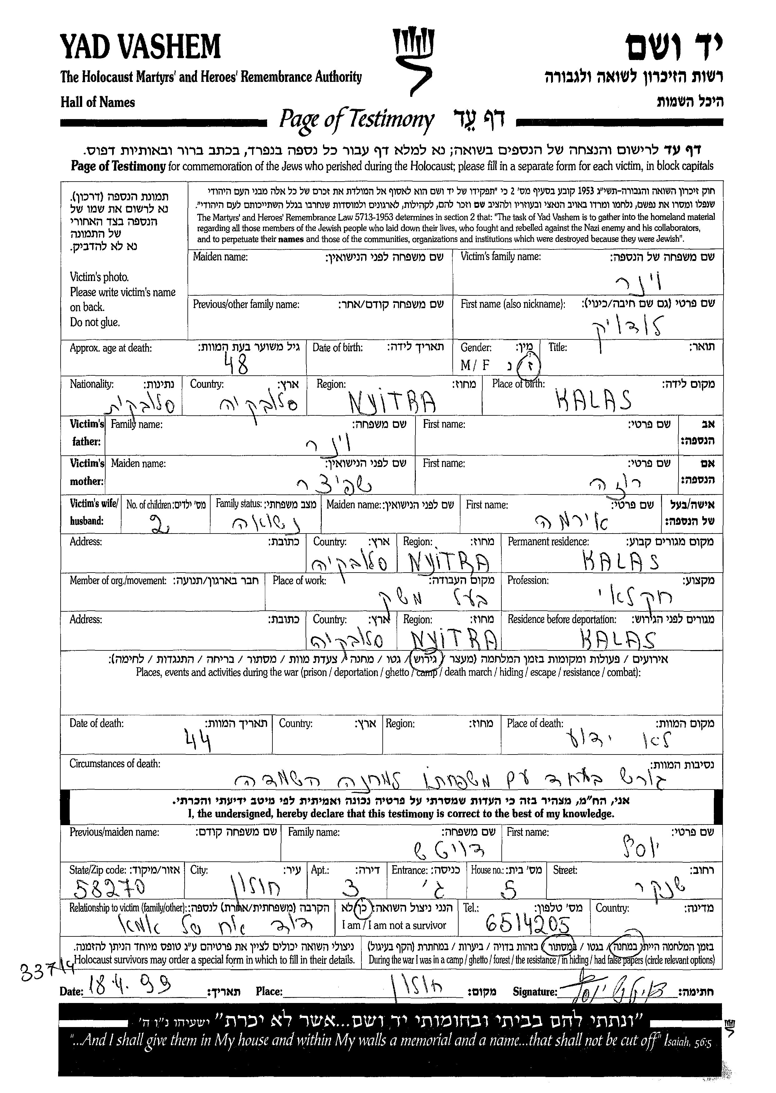 Ludvig Viner wurde in Kalasz, Ungarn geboren. Er war der Sohn von Roza. Er war Landwirt und mit Irma Verheiratet. Vor dem Zweiten Weltkrieg lebte er in Nyitra, Tschechoslowakei. Während des Krieges war er in Nyitra, Tschechoslowakei.