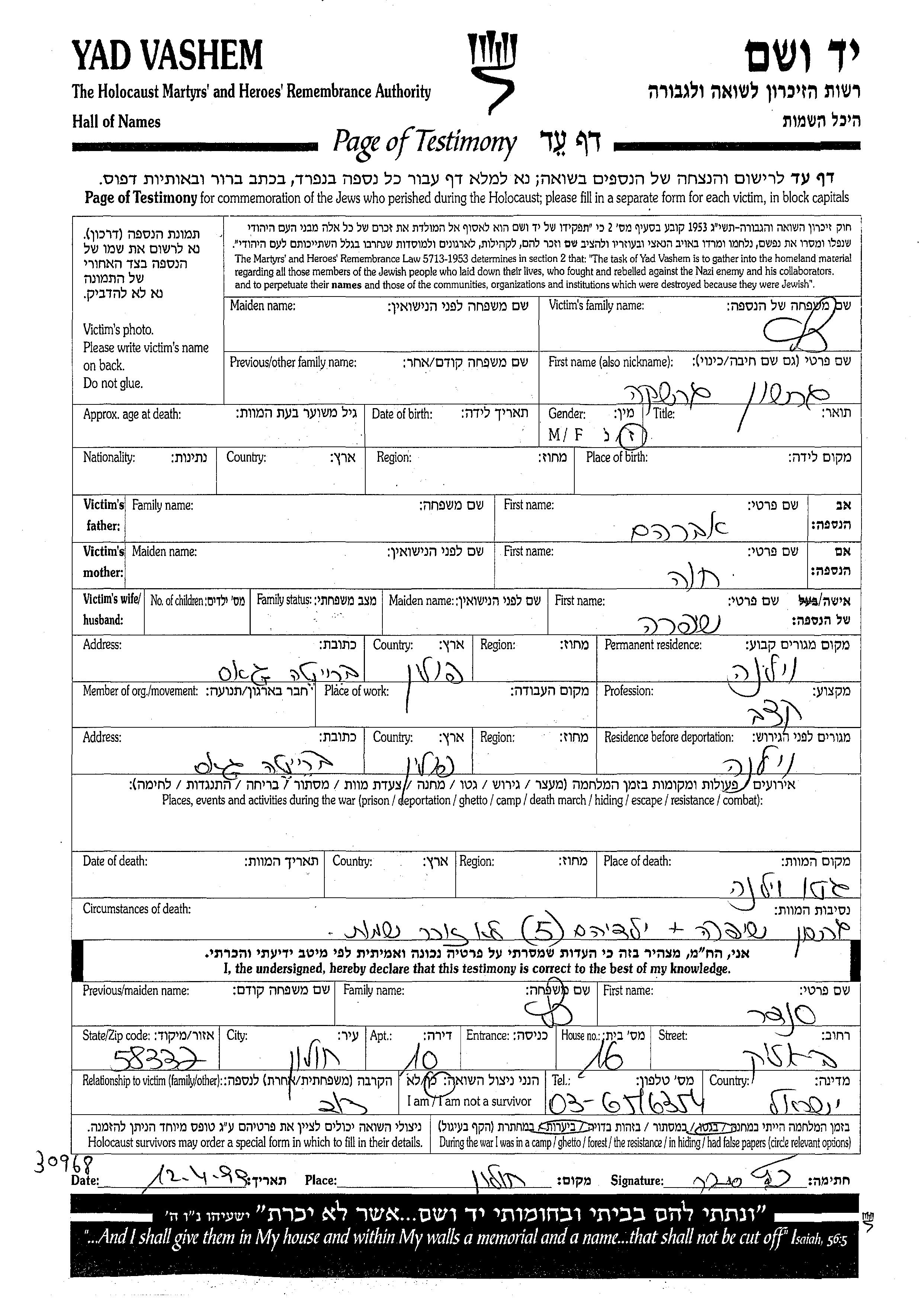 Gershon Gershka wurde in der Schoah ermordet. Todesort: Wilna, Polen.
