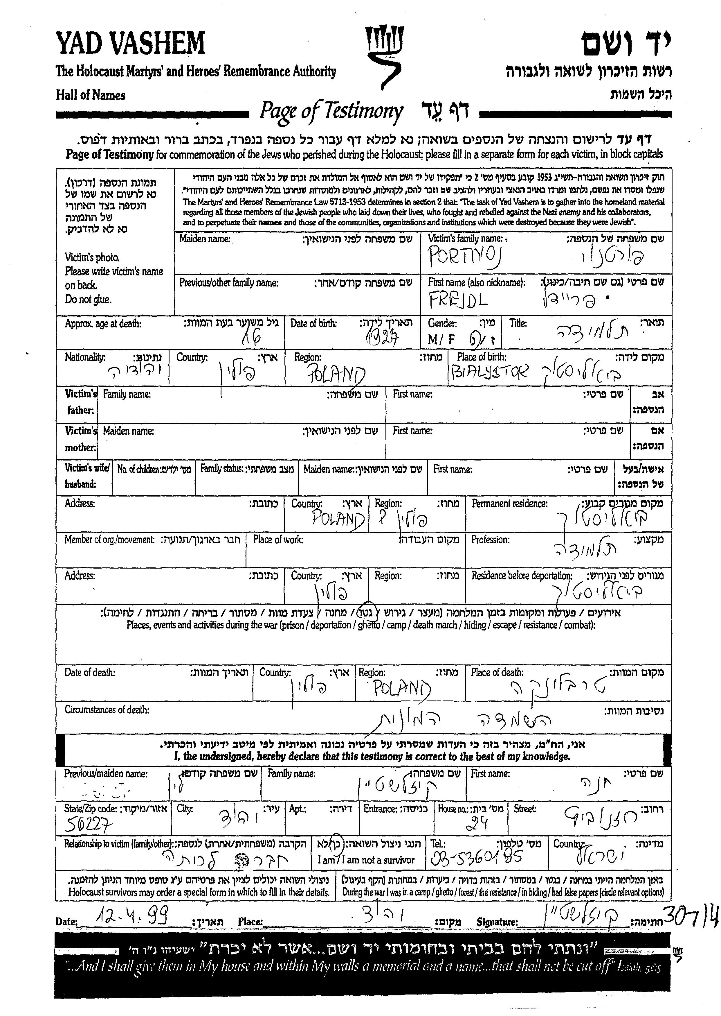 Frejdl Freidel Portnoj wurde im Jahr 1927 in Bialystok, Polen geboren. Sie war Schüler/-in. Vor dem Zweiten Weltkrieg lebte sie in Bialystok, Polen. Während des Krieges war sie in Bialystok, Polen.