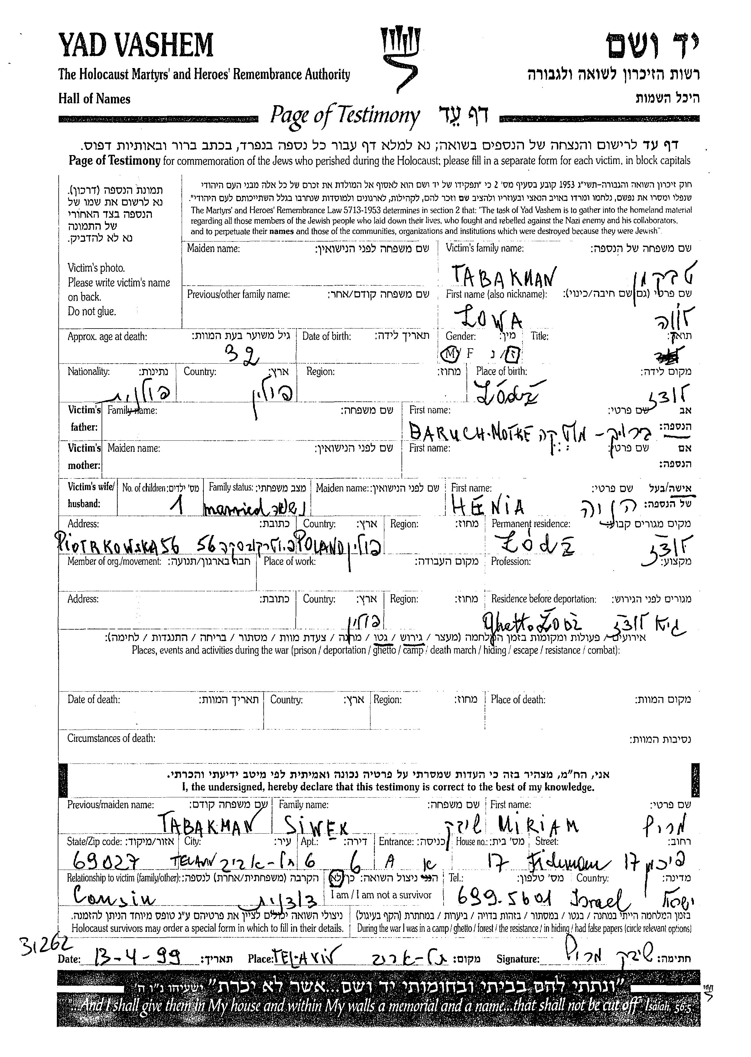 Lowa Tabakman wurde in Lodz, Polen geboren. Er war der Sohn von Baruch Motke. Er war mit Henia Verheiratet. Vor dem Zweiten Weltkrieg lebte er in Lodz, Polen. Während des Krieges war er in Lodz, Polen.