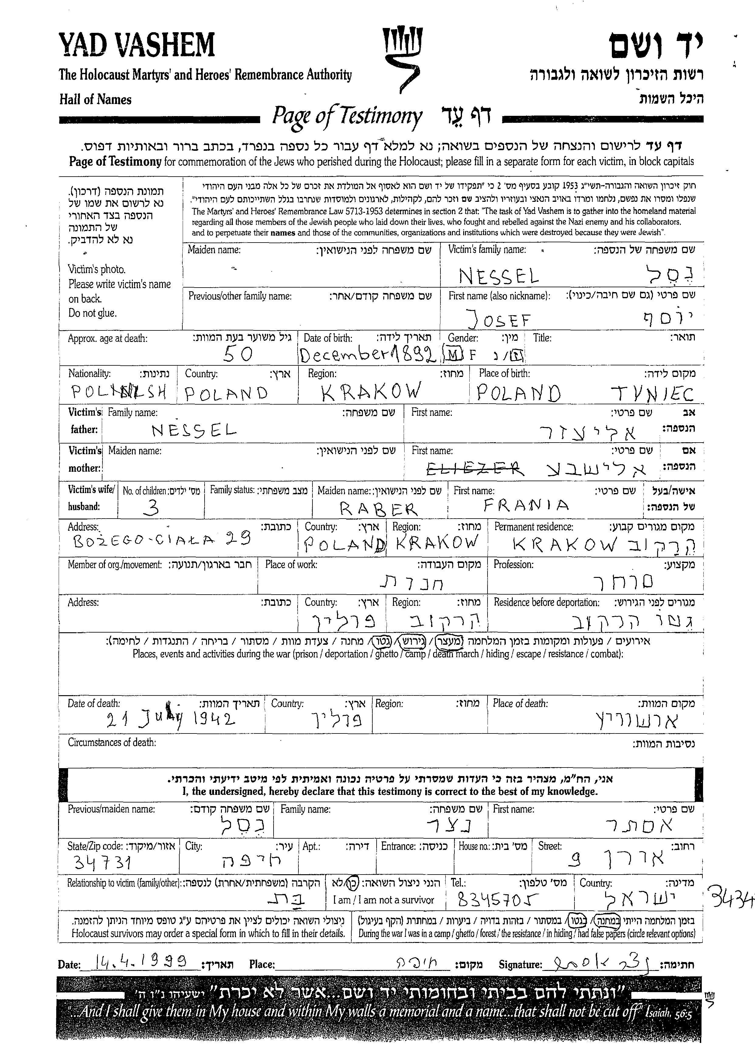 Yosef Nessel wurde im Jahr 1892 in Tyniec, Polen geboren. Er war der Sohn von Eliezer und Elisheva. Er war Kaufmann/-frau. Vor dem Zweiten Weltkrieg lebte er in Krakow, Polen. Während des Krieges war er in Krakow, Polen.