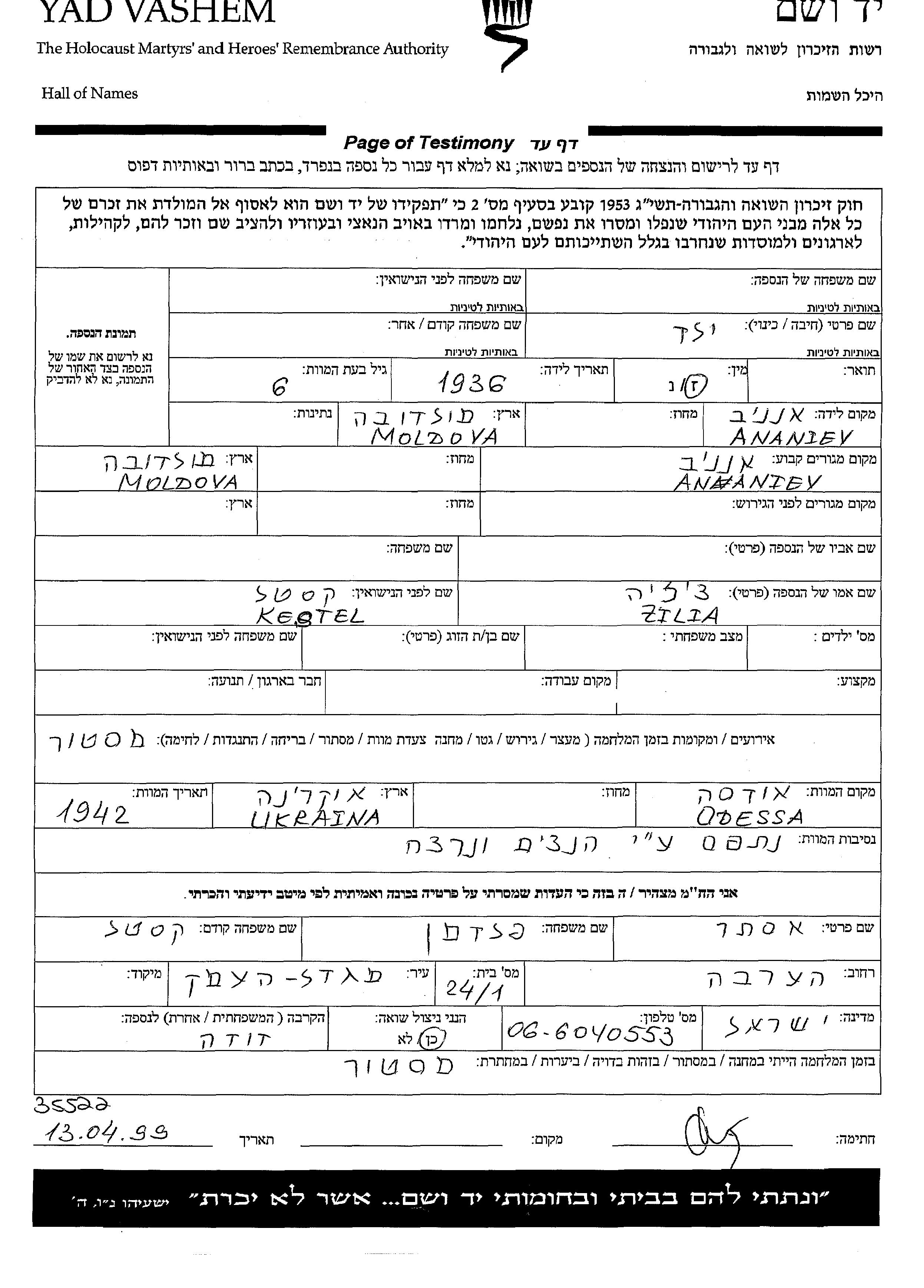 Vorname unbekannt Name unbekannt wurde im Jahr 1936 in Ananiev, Ukraine (UdSSR) geboren. Er war der Sohn von Zilia. Vor dem Zweiten Weltkrieg lebte er in Ananiev, Ukraine (UdSSR).