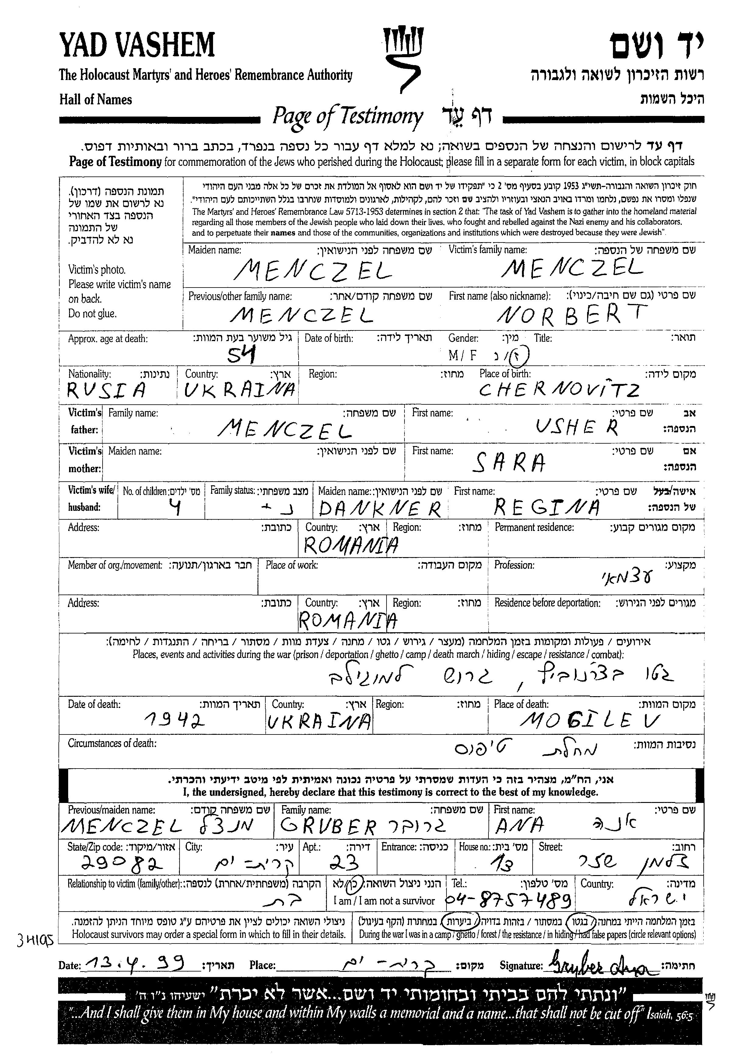 Norbert Menczel wurde in Chernovitz, Rumänien geboren. Er war der Sohn von Usher und Sara. Er war Selbständig und mit Regina, geb. Dankner Verheiratet. Vor dem Zweiten Weltkrieg lebte er in Rumänien. Während des Krieges war er in Rumänien.